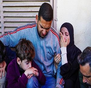 فلسطينيون يودعون جثمان الشهيد يوسف منصور، الذي ارتقى في غارة إسرائيلية أثناء عمله في صيد الطيور في منطقة المواصي بخان يونس جنوب قطاع غزة.