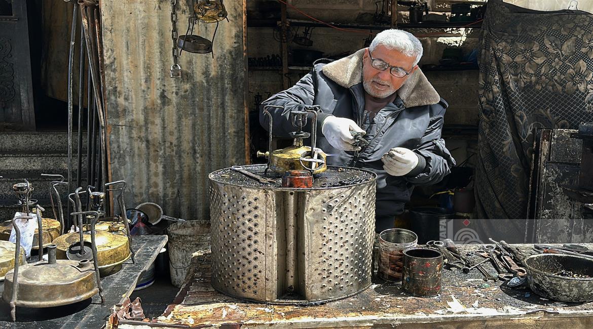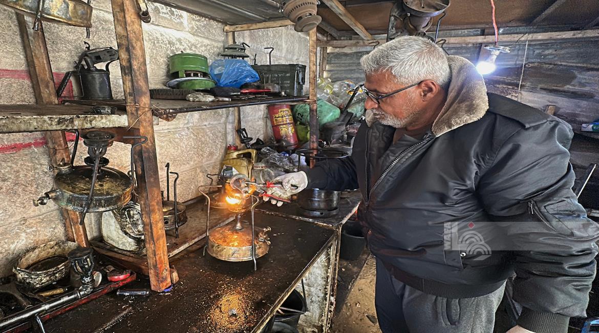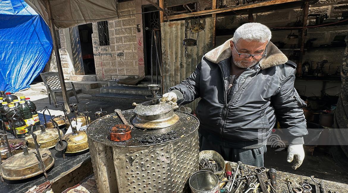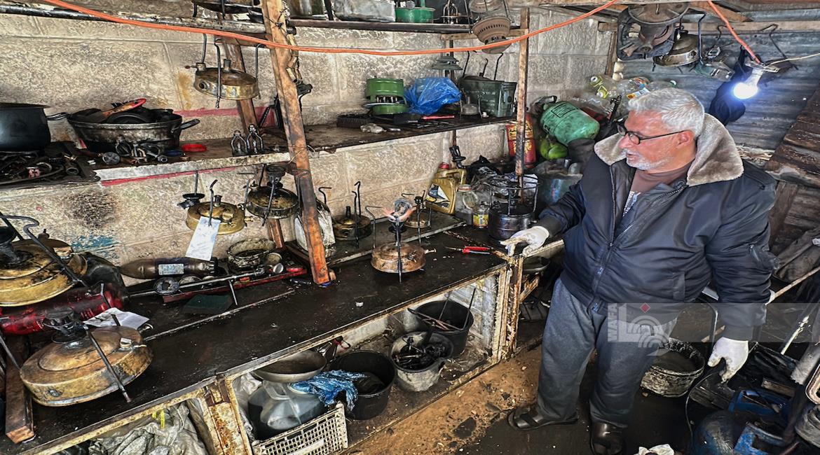 غزة - عادل عيسى يعيد العمل في صيانة مواقد الكاز "البابور" في مخيم الشاطئ بغزة في ظل النقص الحاد بغاز الطهي