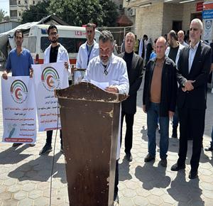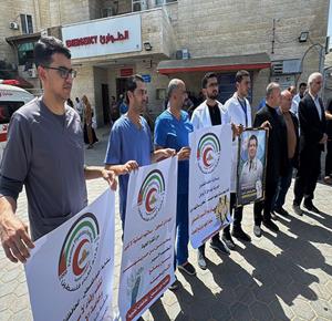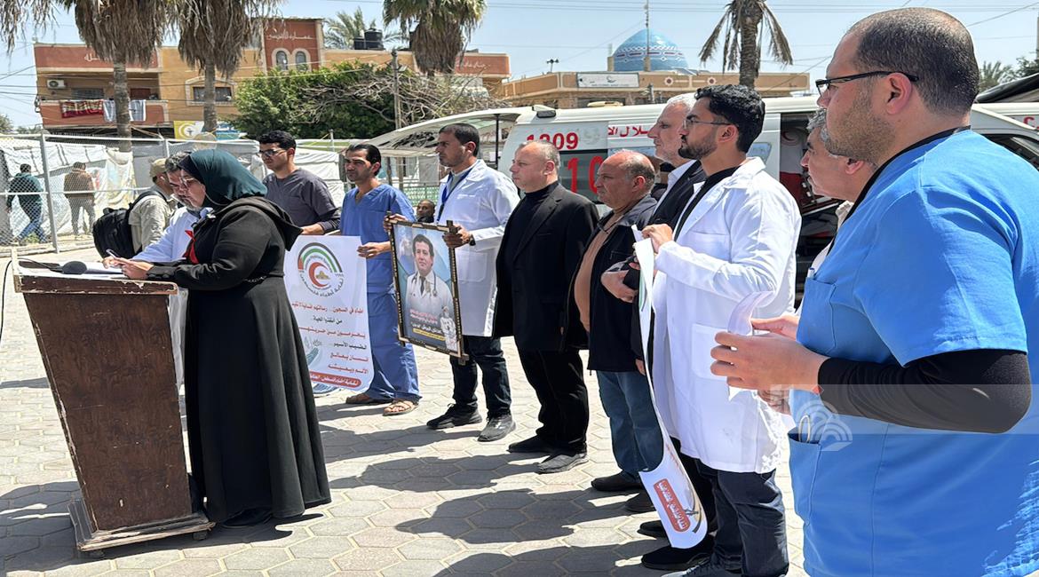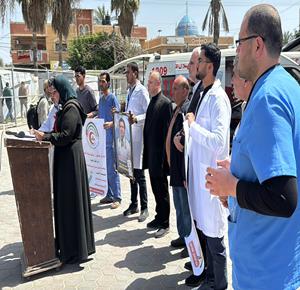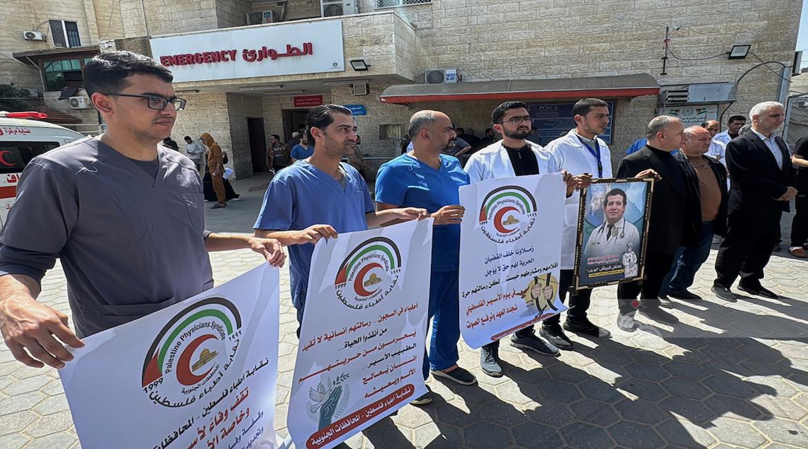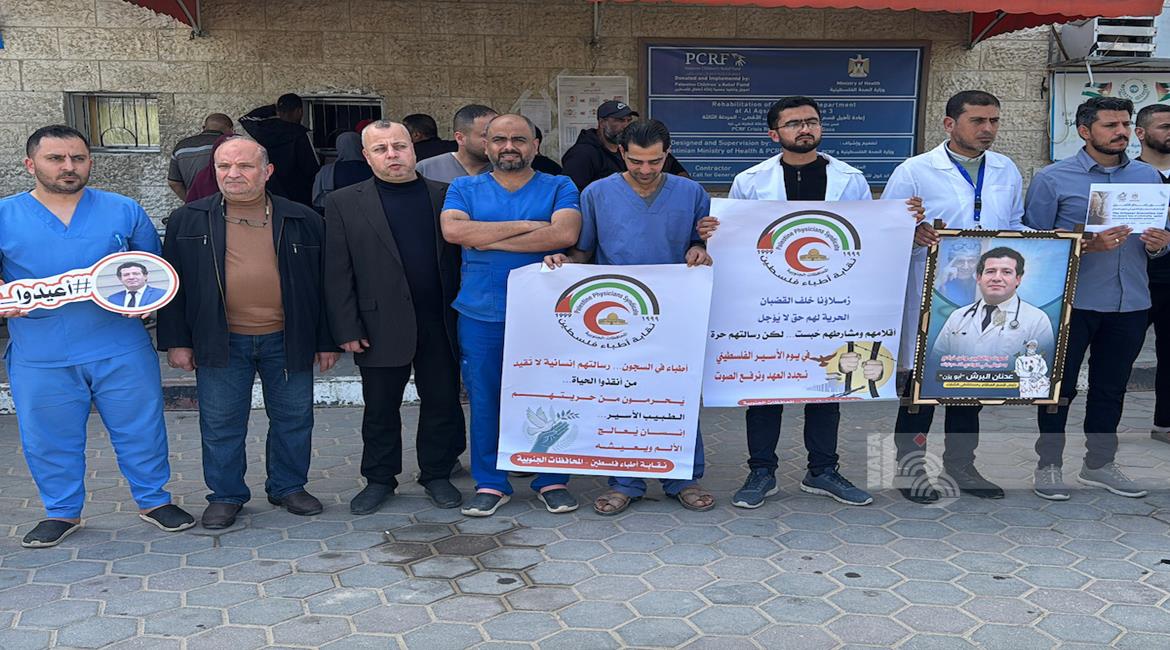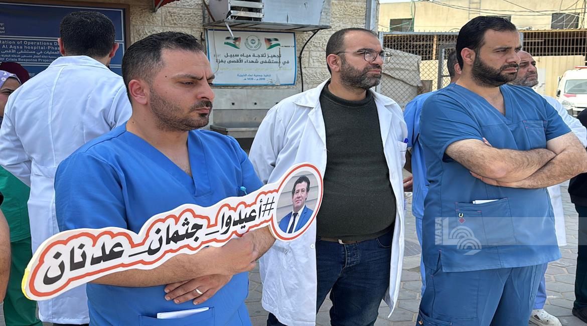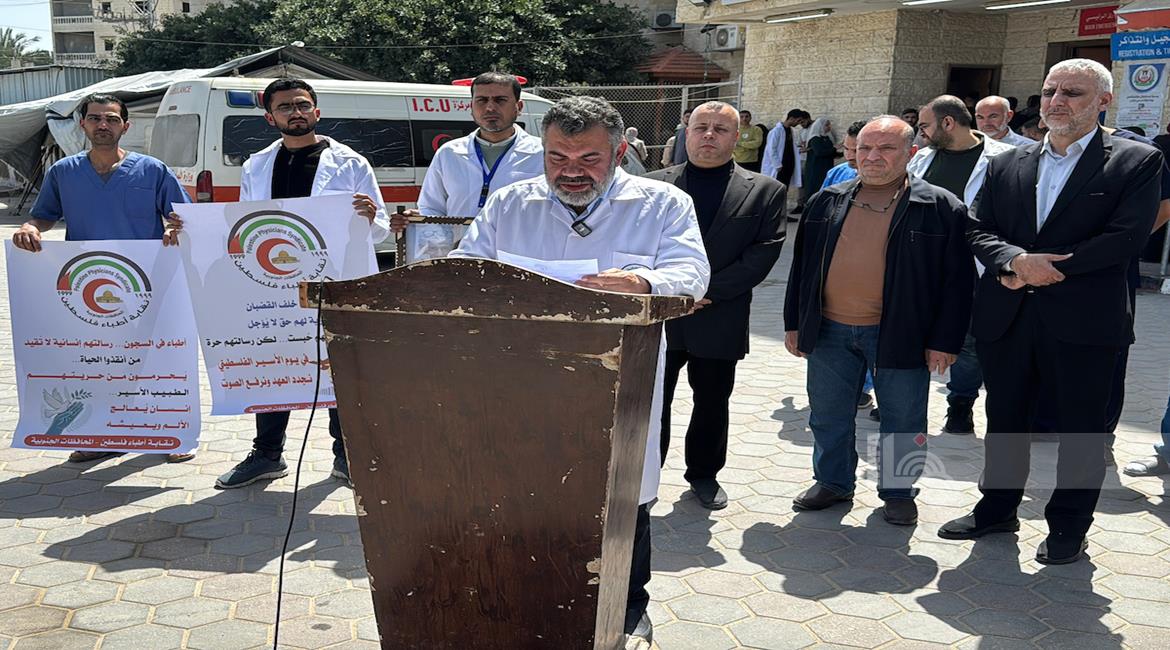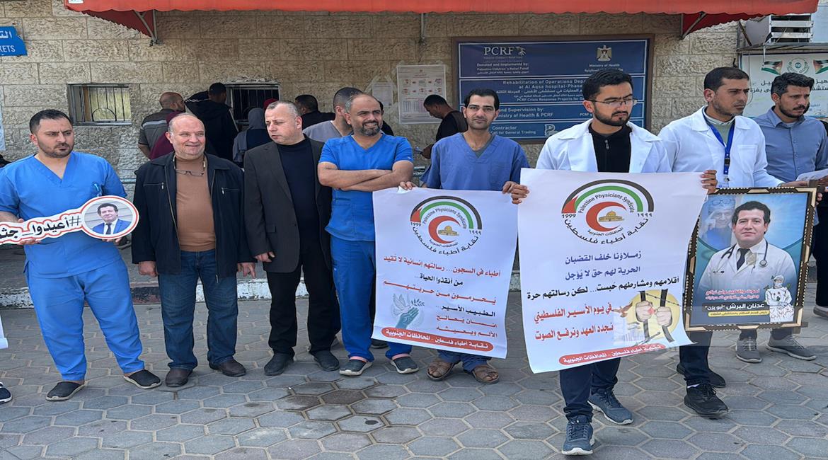 غزة - أطباء ينظمون وقفة احتجاجية في ساحة مستشفى الأقصى بمدينة دير البلح وسط قطاع غزة، للمطالبة بالإفراج عن زملائهم من الأطباء والممرضين المعتقلين في سجون الاحتلال