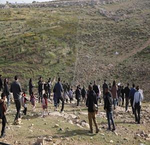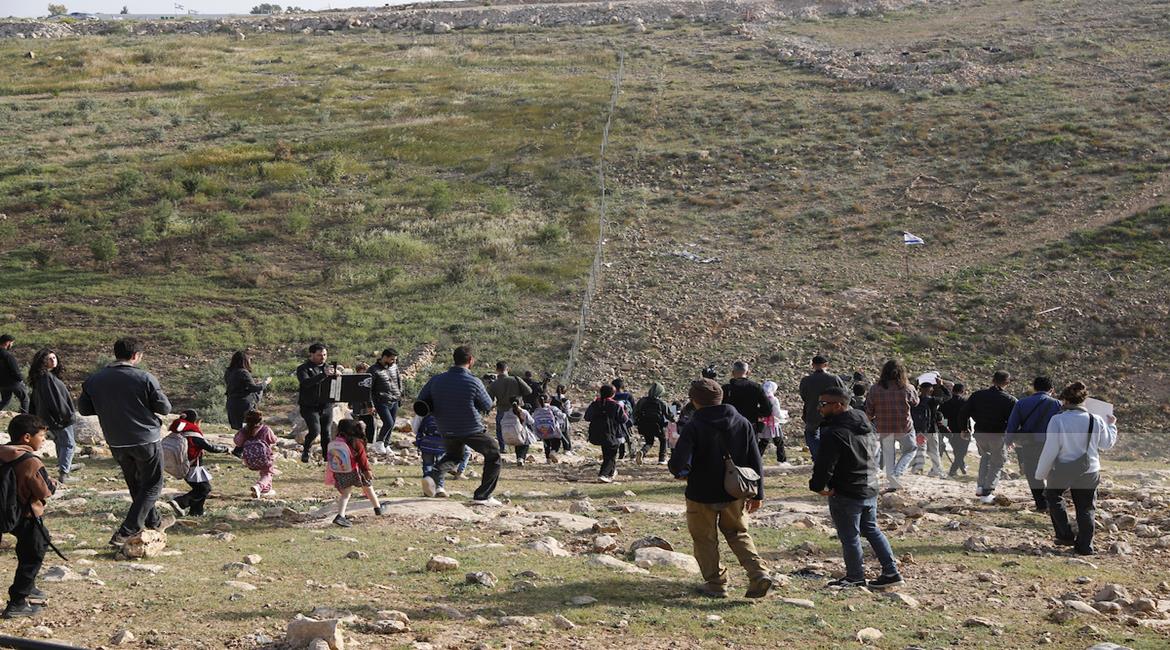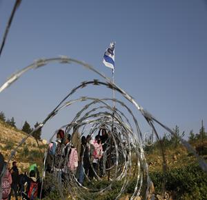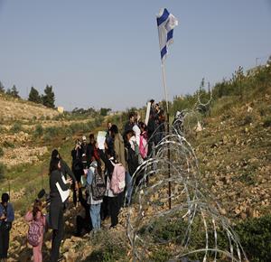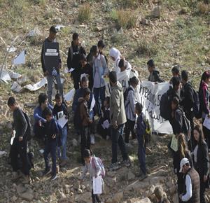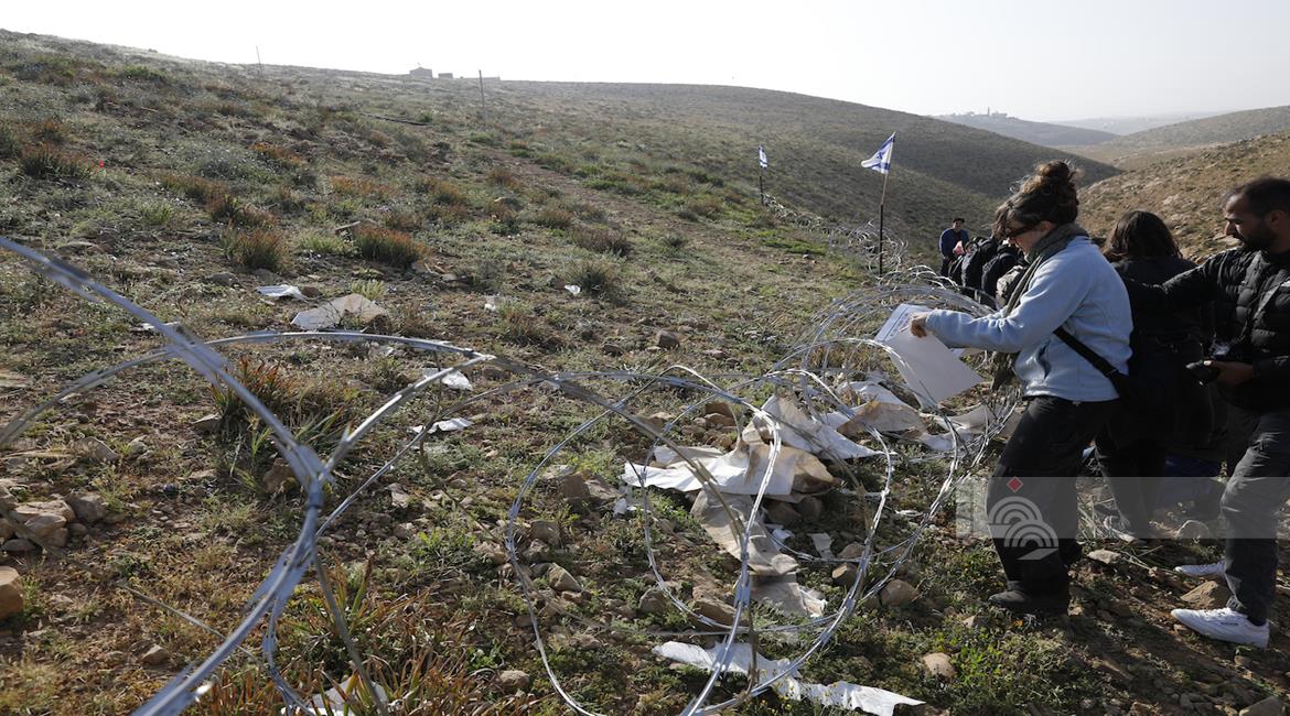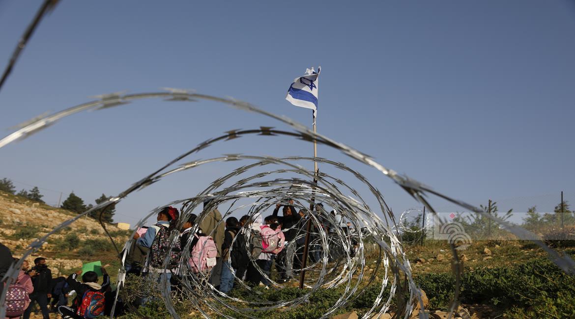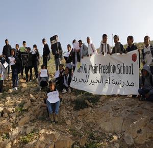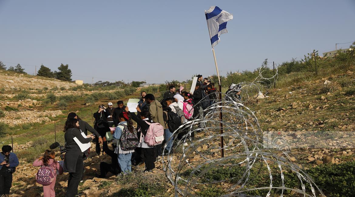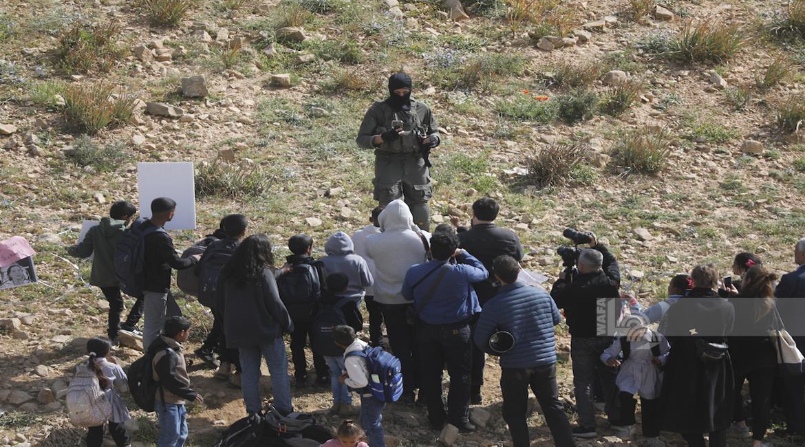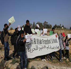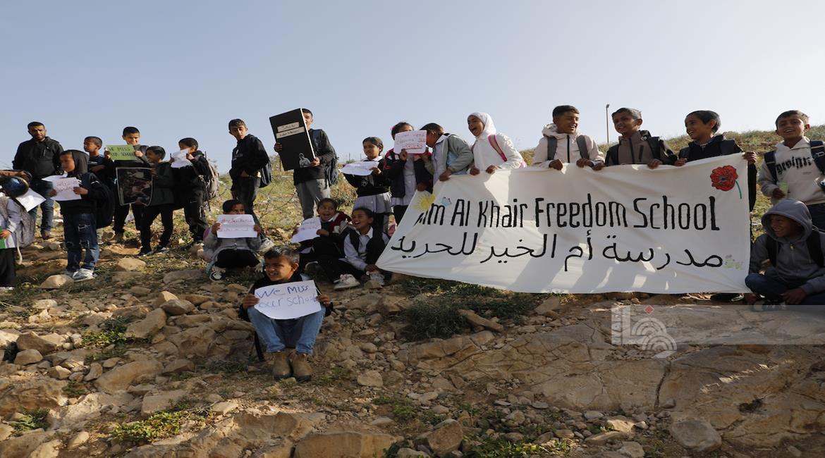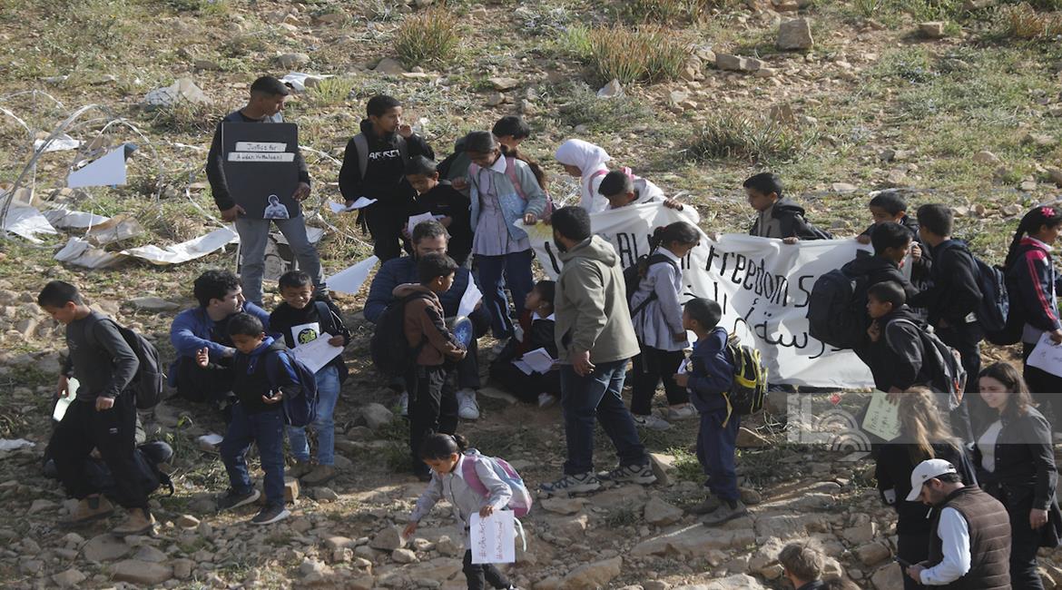 الخليل - أطفال خربة أم الخير وبمشاركة نشطاء سلام دوليين ينظمون وقفة سلمية احتجاجا على إغلاق الجيش الإسرائيلي للطريق الرئيسي المؤدي إلى مدارسهم منذ أسبوع