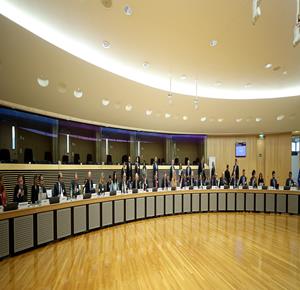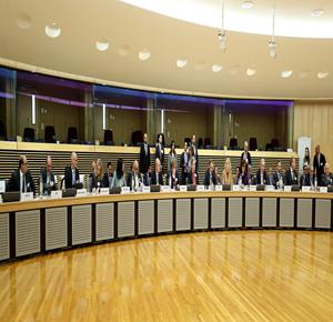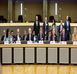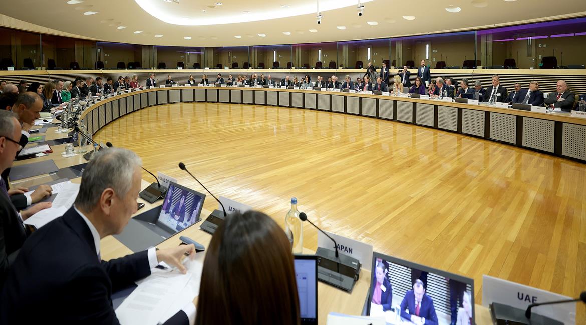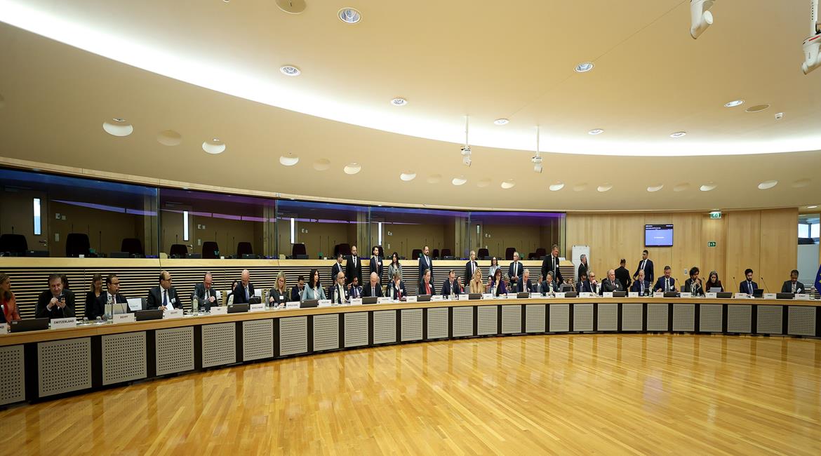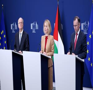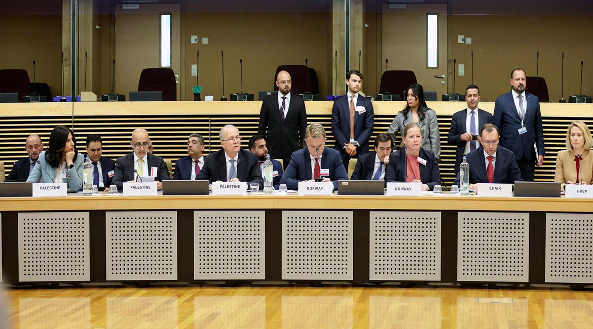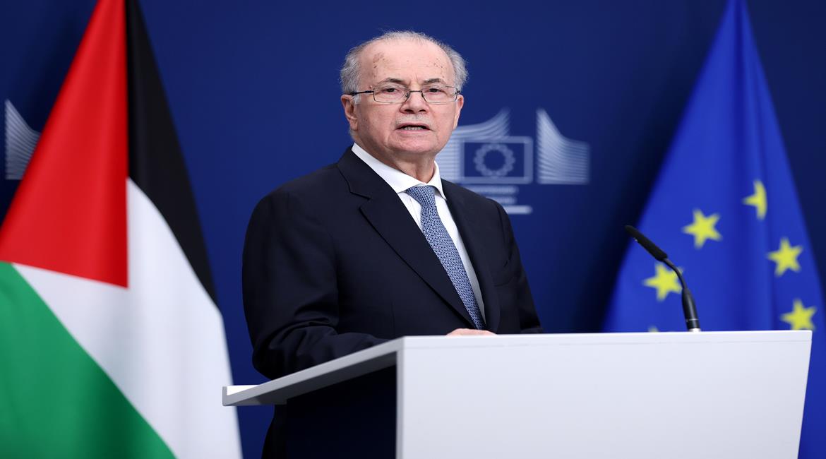رئيس الوزراء محمد مصطفى خلال كلمتة في الاجتماع التاسع للتحالف الدولي لتنفيذ حل الدولتين الذي عقد في العاصمة البلجيكية بروكسل