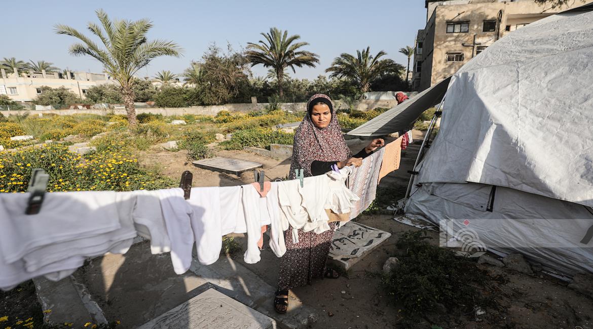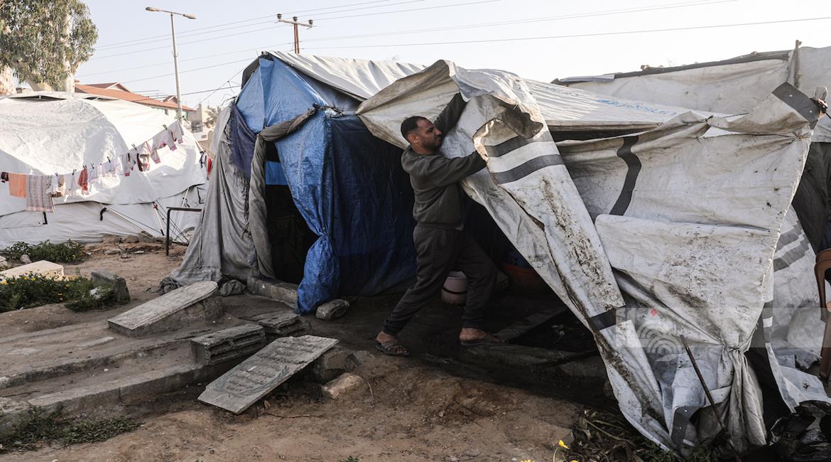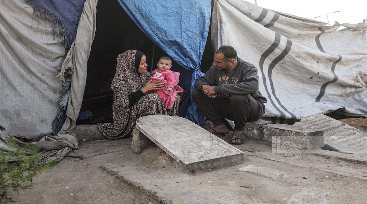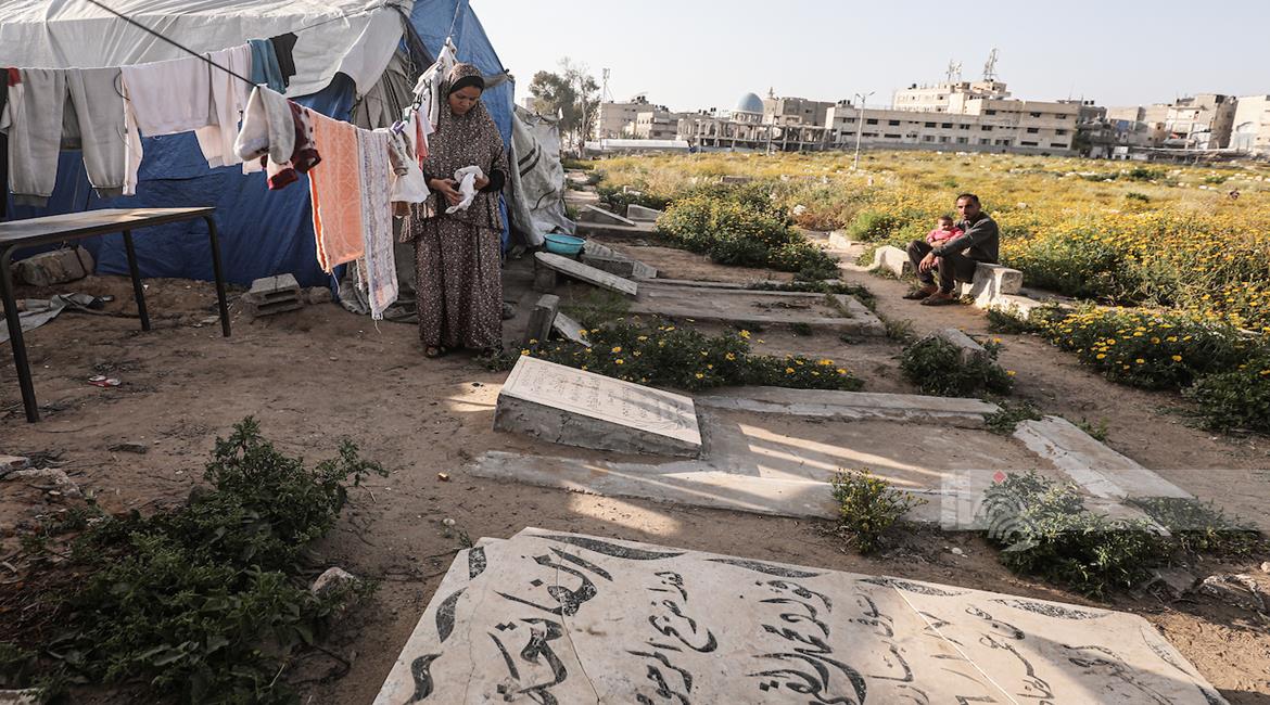 غزة - النازح خالد الزعانين يعيش مع أسرته في ظروف غير إنسانية في خيمة داخل مقبرة بدير البلح وسط قطاع غزة، بعد نزوحه من بيت حانون