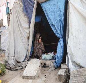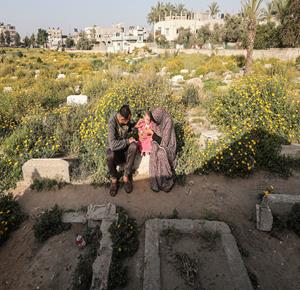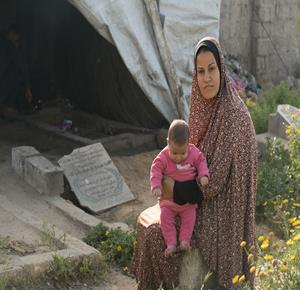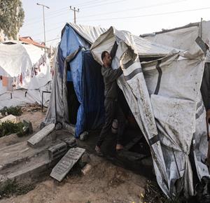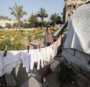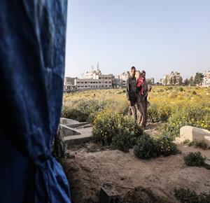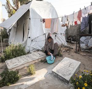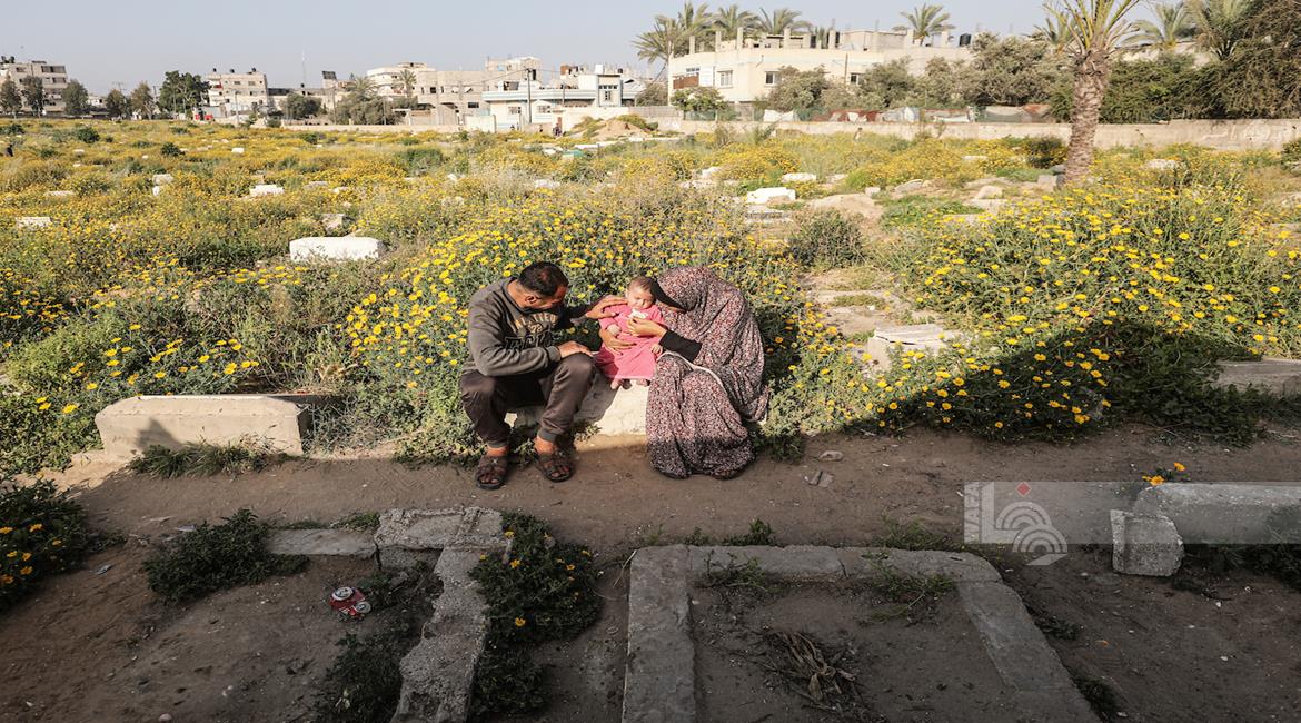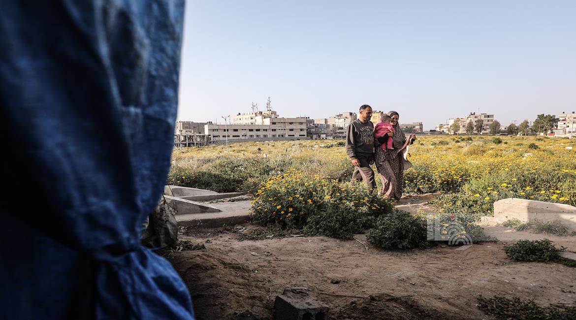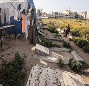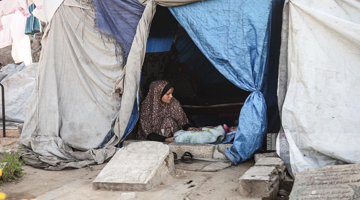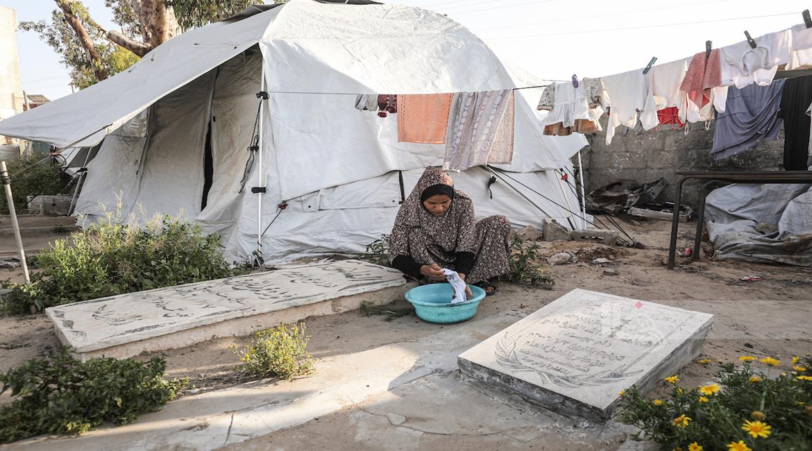 غزة - النازح خالد الزعانين يعيش مع أسرته في ظروف غير إنسانية في خيمة داخل مقبرة بدير البلح وسط قطاع غزة، بعد نزوحه من بيت حانون