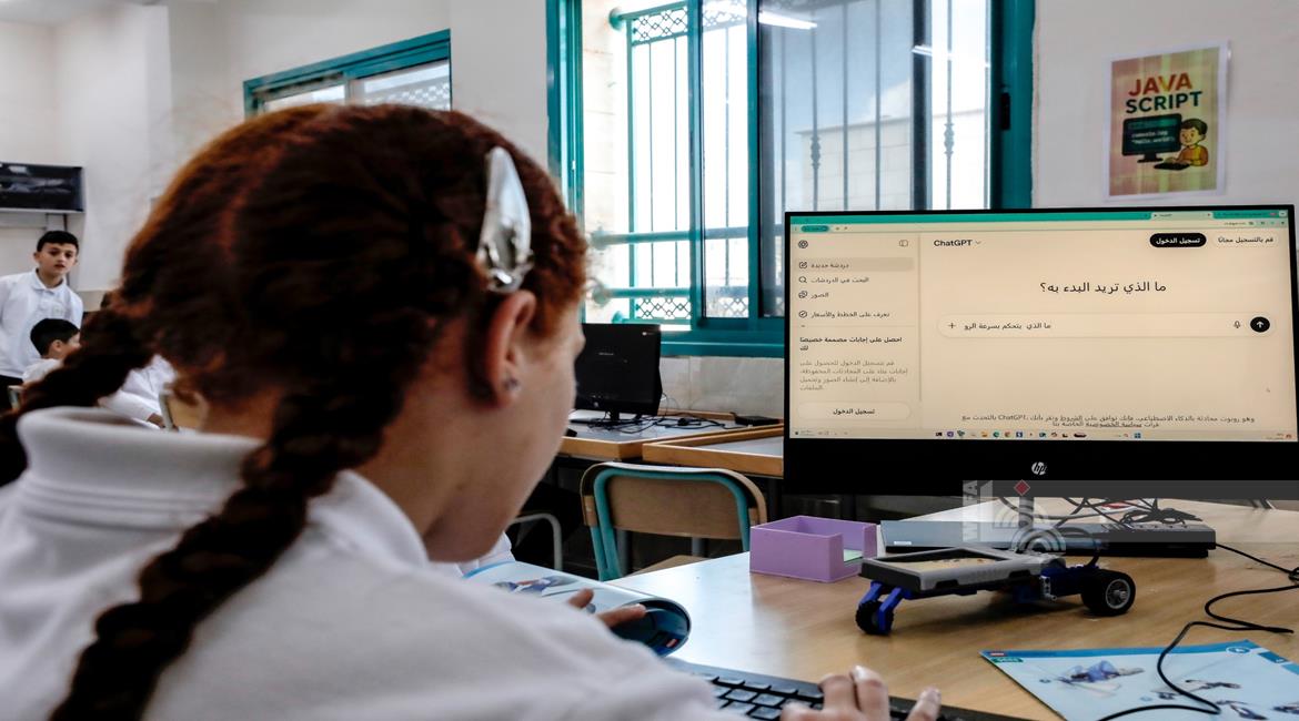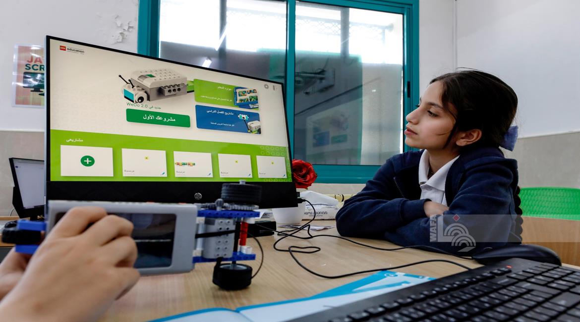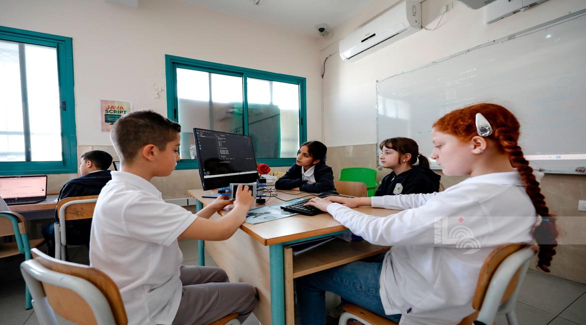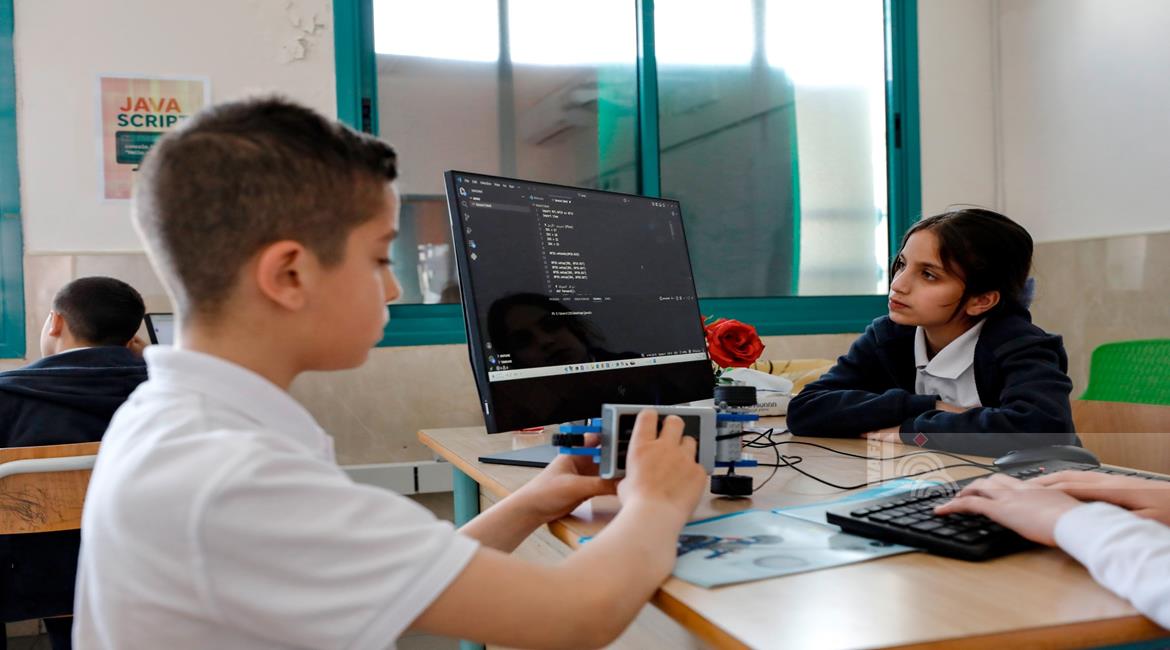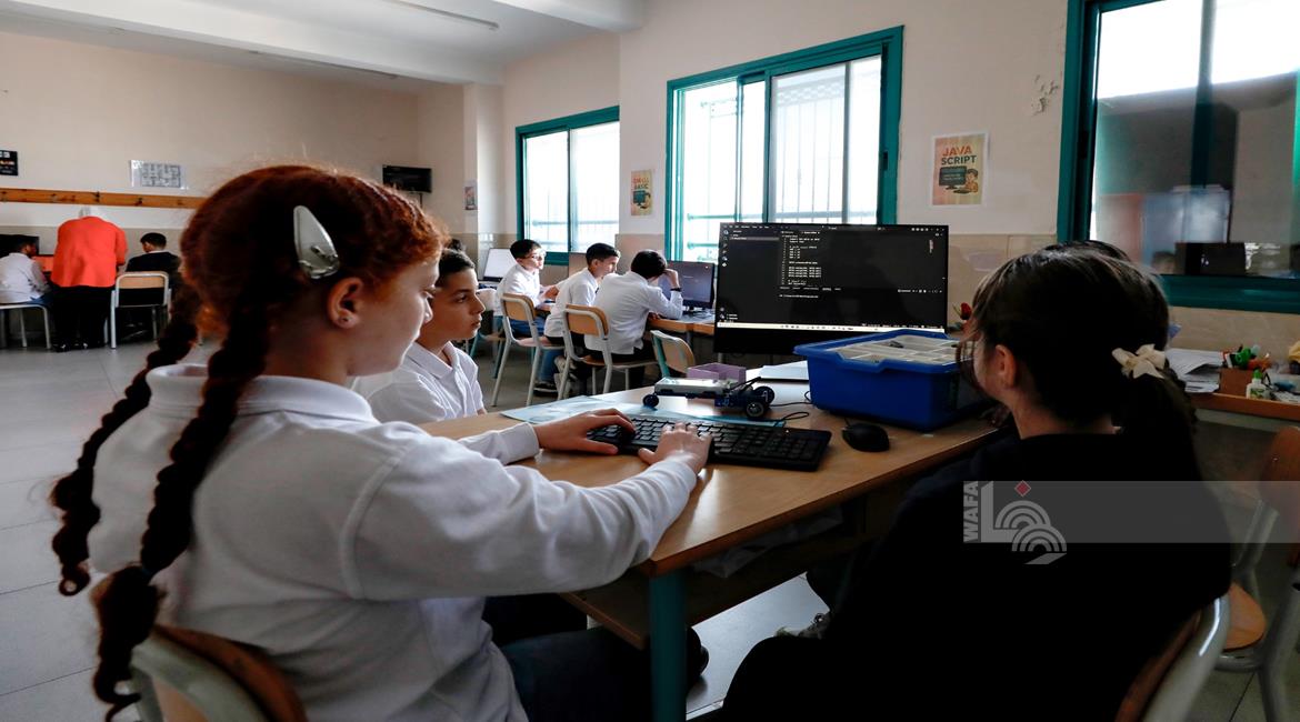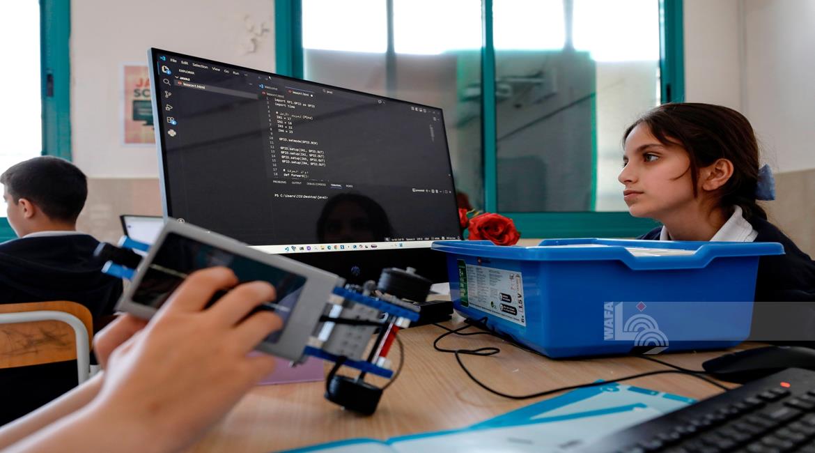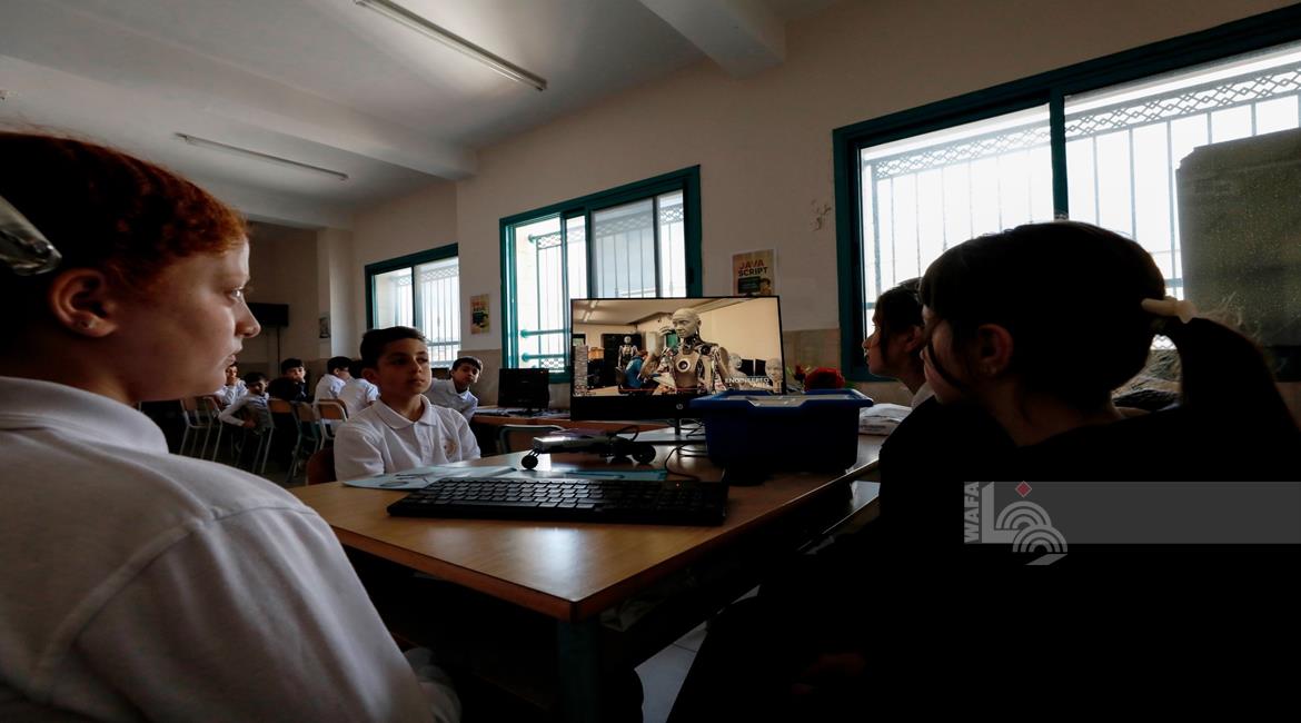 جنين - طلاب اثناء تعلمهم استخدام الذكاء الاصطناعي في العمليات الحسابية والتحكم في "روبوت" آلي