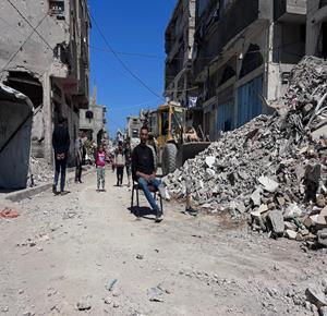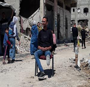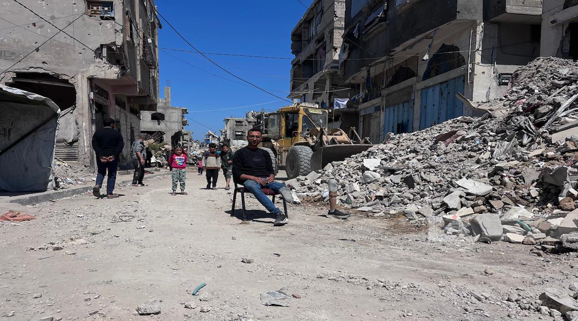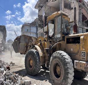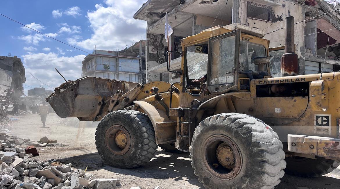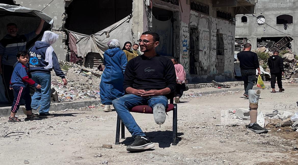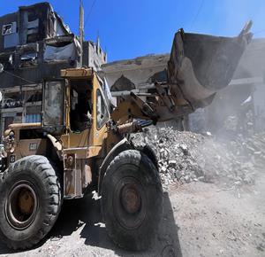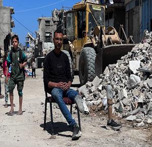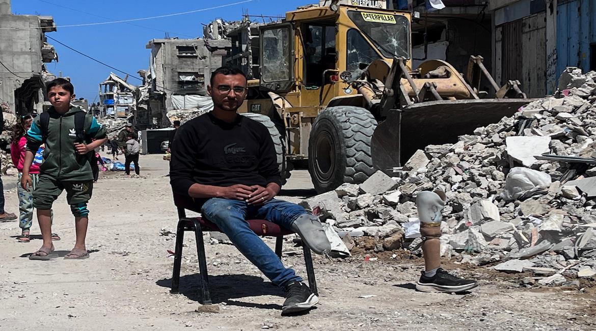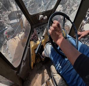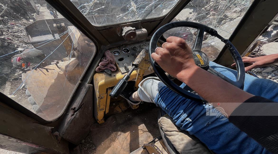 غزة - الشاب محمود كحيل فقد ساقه بغارة إسرائيلية، يعود إلى عمله سائقا لجرافة لإزالة أنقاض المنازل المدمرة، وتمهيد الطرق في مدينة غزة