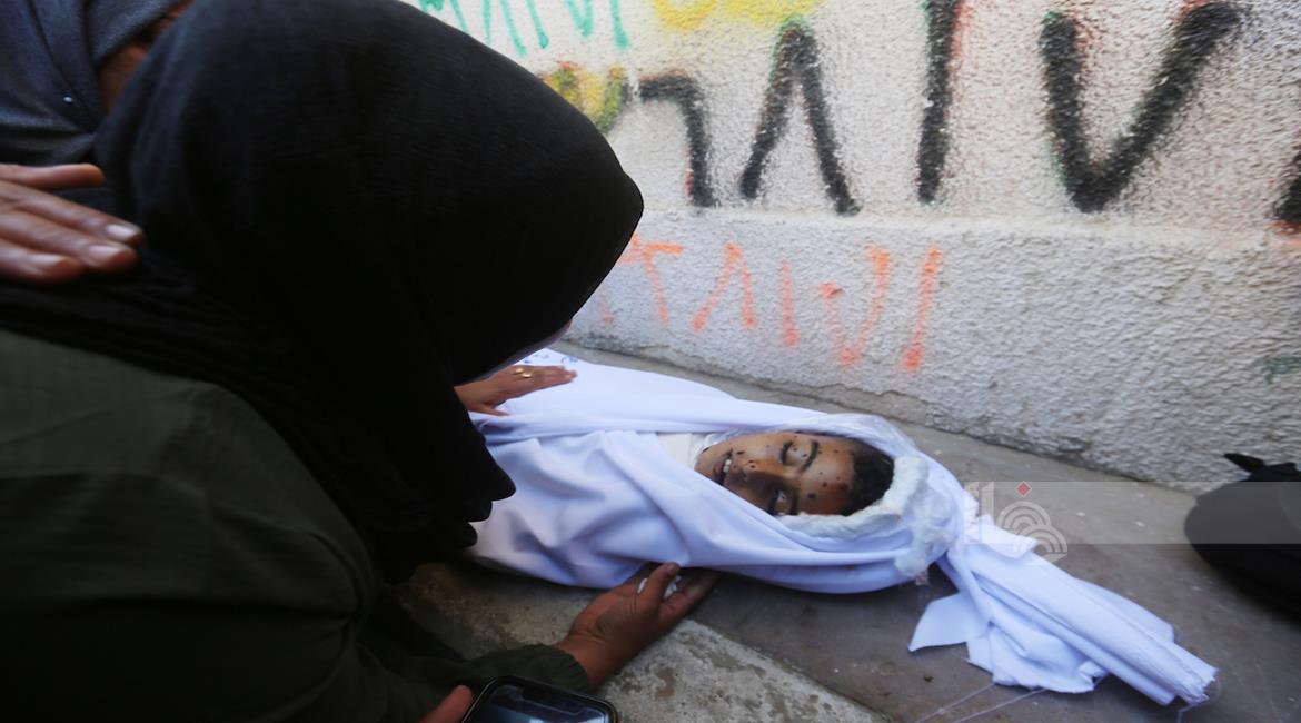 وداع الشهيد الشاب عودة عاطف عواودة (25 عاما)، من بلدة دير دبوان شرق رام الله، في مجمع فلسطين الطبي