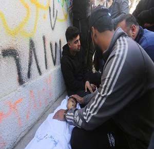 مواطنون يودّعون جثمان شهيد في مستشفى الشفاء بمدينة غزة، ارتقى جراء استهداف طائرة مسيّرة إسرائيلية لمجموعة من المواطنين في بلدة جباليا شمال قطاع غزة