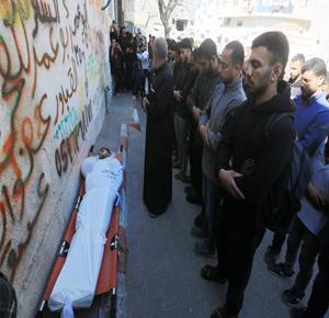 وداع الشهيدة رشا أبو جزار (40 عاما)، وهي حامل في شهرها السابع، والتي قتلت برصاص الاحتلال الإسرائيلي في منطقة المواصي بمدينة رفح جنوب قطاع غزة