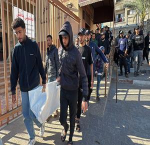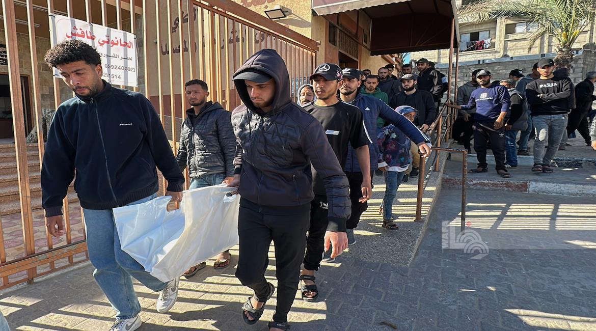 عدد من المرضى والجرحى برفقة مرافقيهم يغادرون مقر الهلال الأحمر في خان يونس، جنوب قطاع غزة، متجهين نحو معبر رفح لتلقي العلاج في الخارج