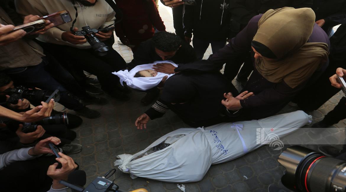 غزة - مواطنون يشيّعون جثامين أم وطفليها من عائلة الطناني، استُشهدوا إثر قصف مدفعي استهدف منزلهم قرب مستشفى كمال عدوان شمال قطاع غزة