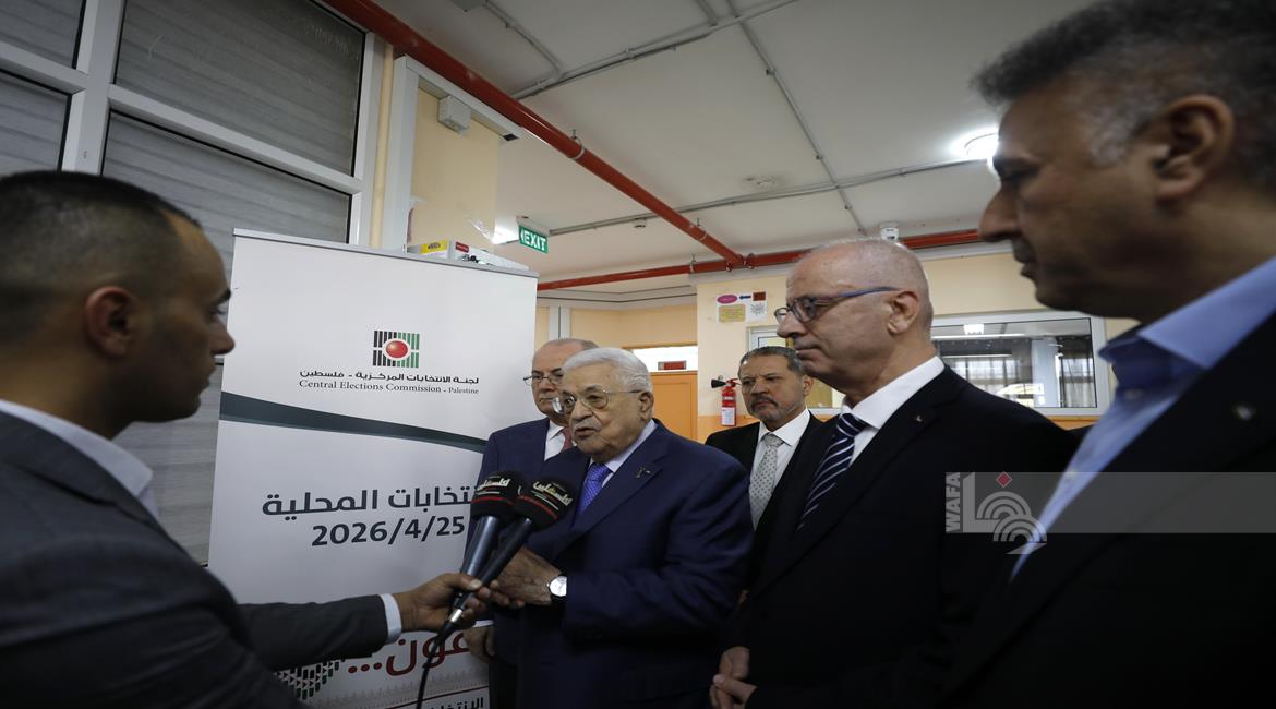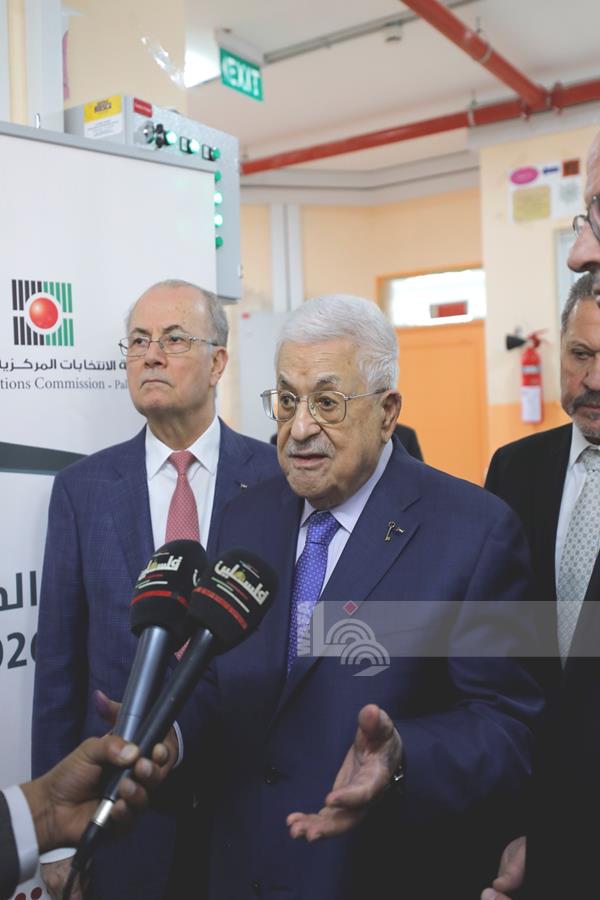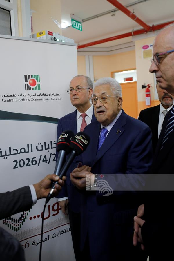 رام الله - الرئيس محمود عباس، يلقي كلمته عقب الادلاء بصوته في انتخابات الهيئات المحلية لعام 2026، بمركز الاقتراع في مدرسة المستقبل الصالح بمدينة البيرة