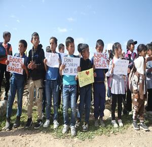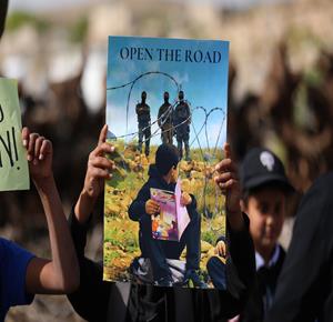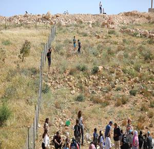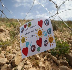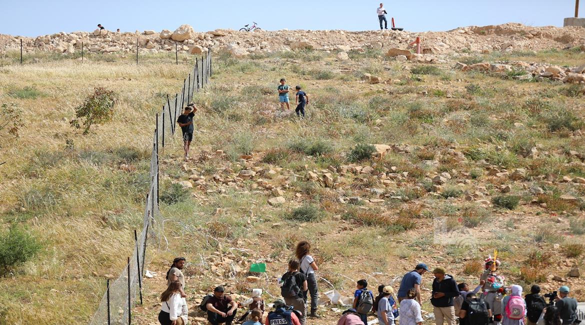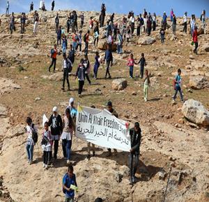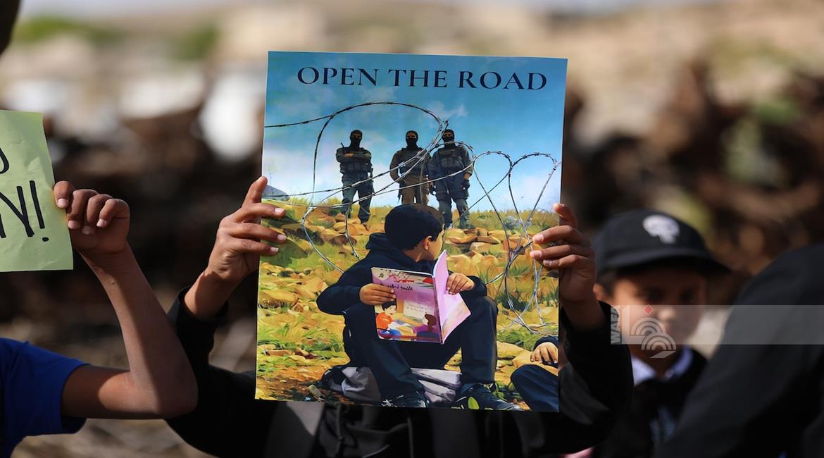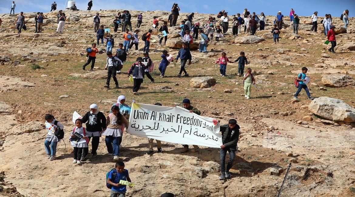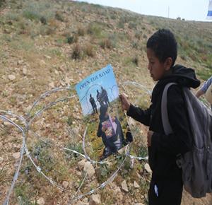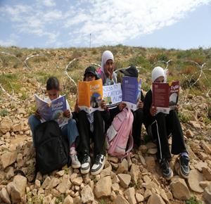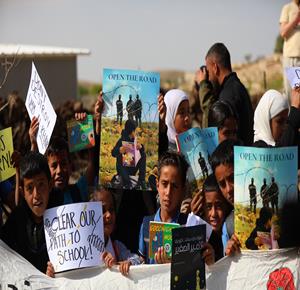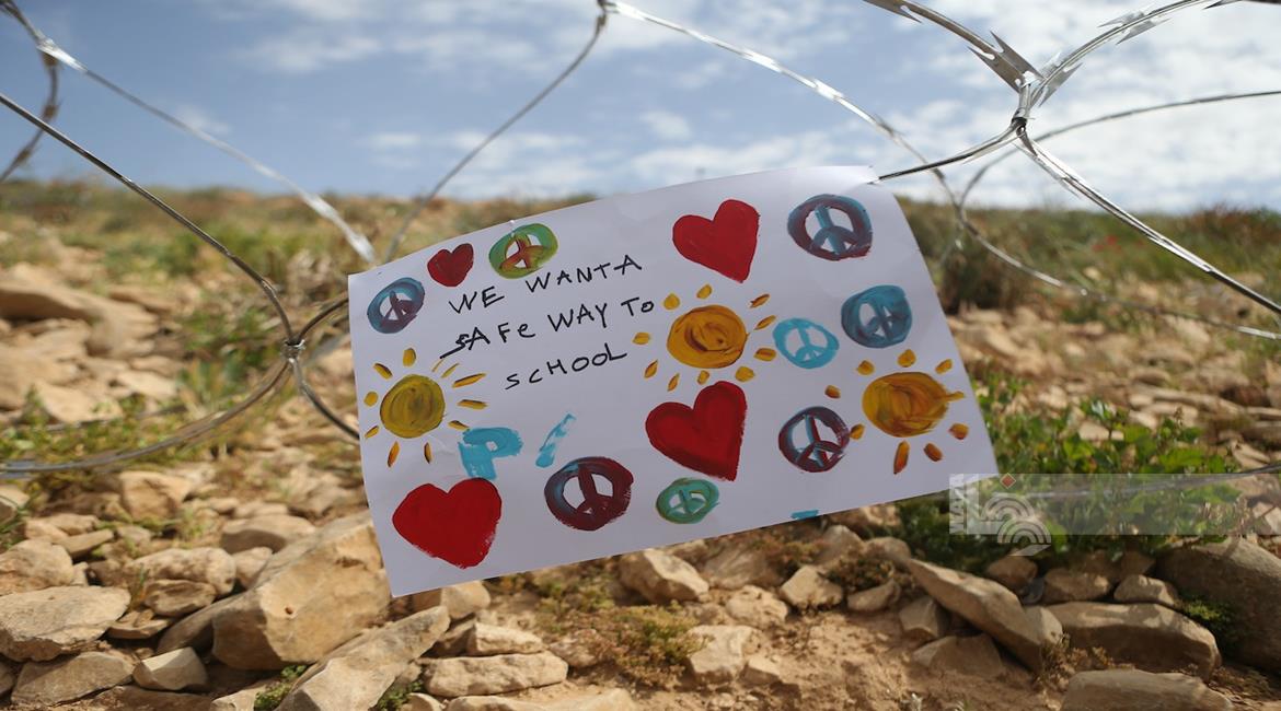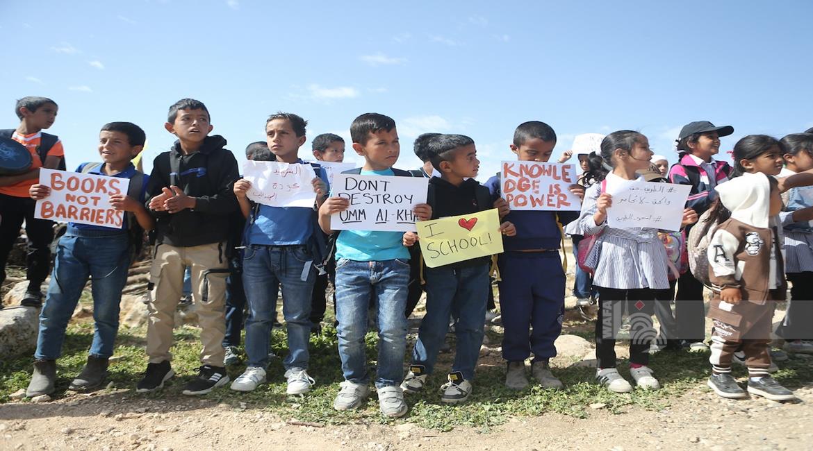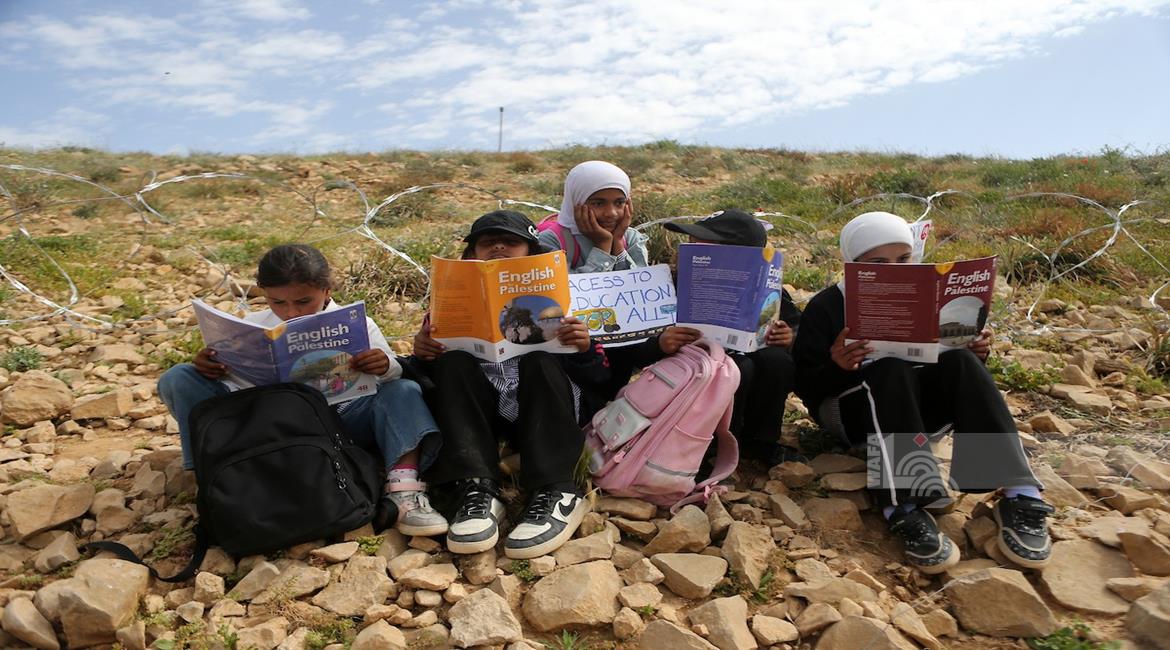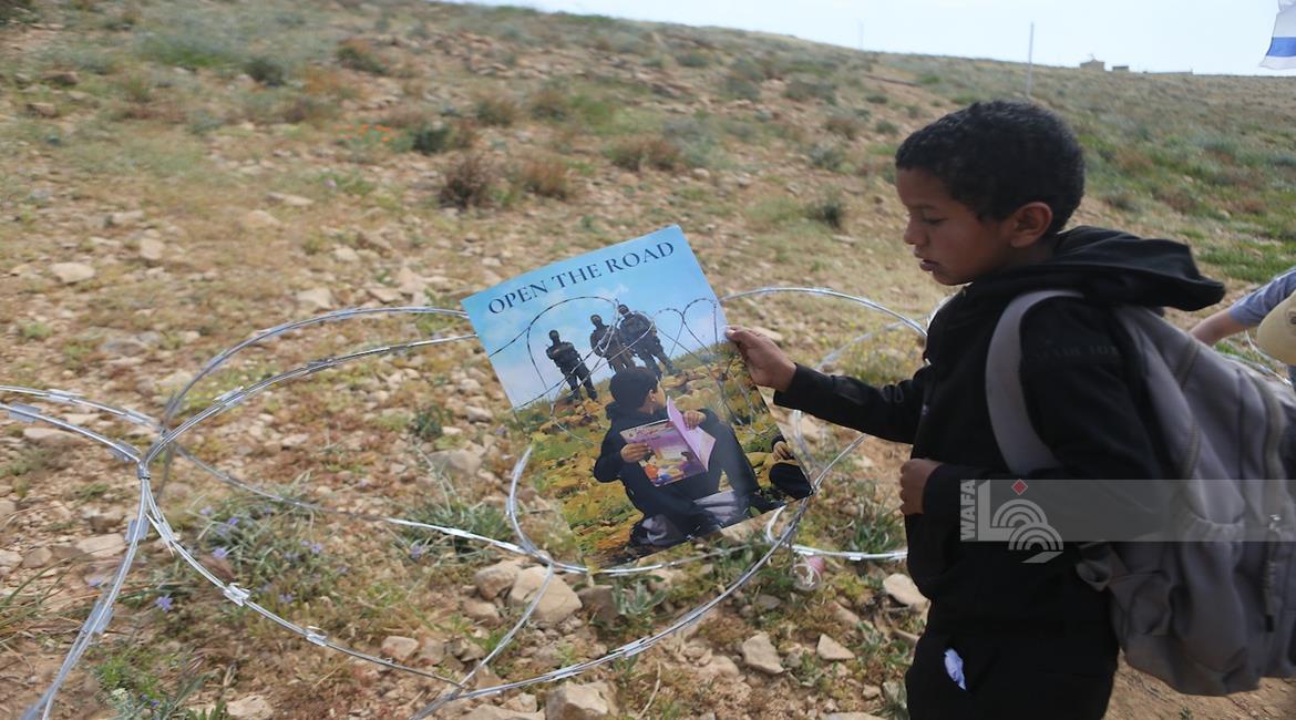الخليل - طلبة خربة ام الخير بمسافر يطا يواصلون الاعتصام والدراسة على جانب طريق مغلق من قبل مستعمرين وقوات الاحتلال الاسرائيلي