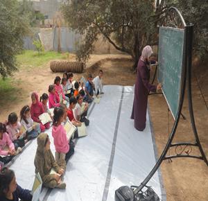 طلبة خربة ام الخير بمسافر يطا يواصلون الاعتصام والدراسة على جانب طريق مغلق من قبل مستعمرين وقوات الاحتلال الاسرائيلي