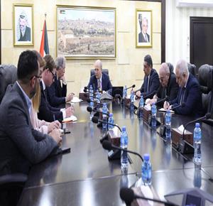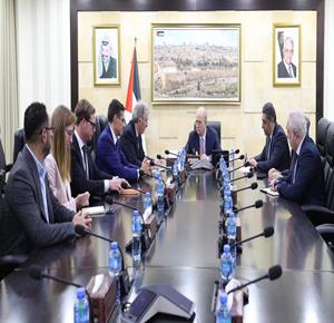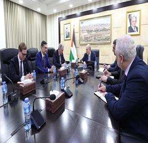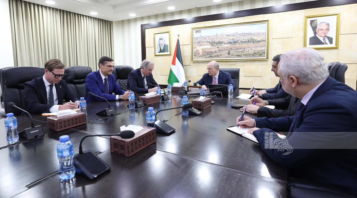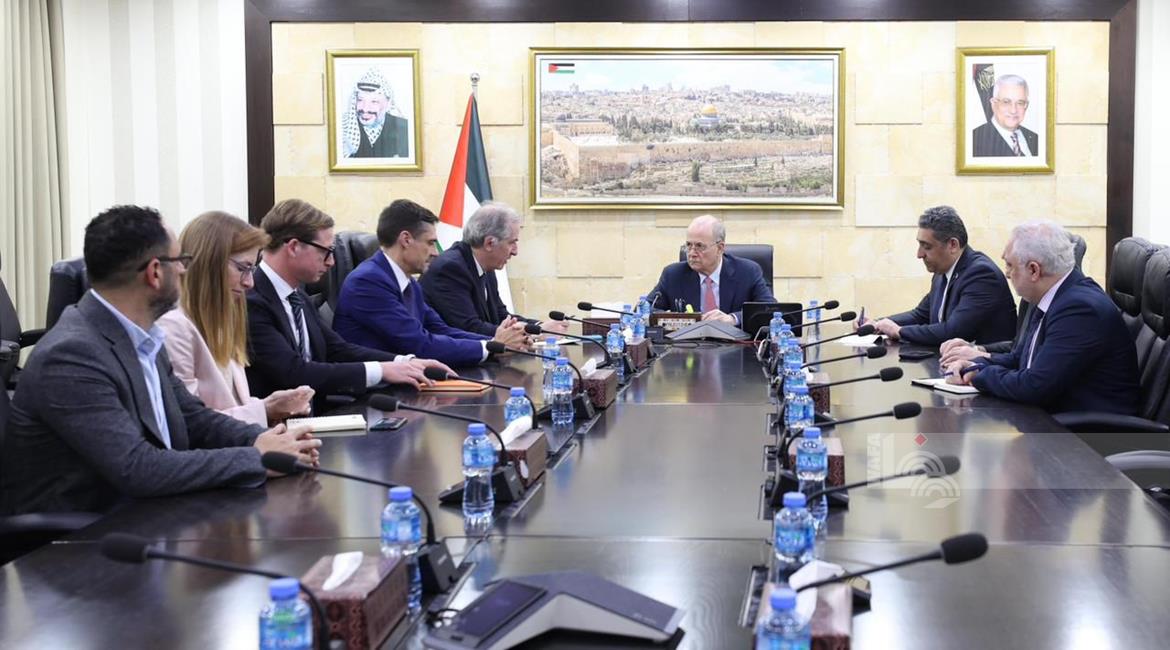 رام الله - رئيس الوزراء محمد مصطفى،خلال لقائه المبعوث الخاص للاتحاد الأوروبي لعملية السلام في الشرق الأوسط كريستوف بيجو، بحضور ممثل الاتحاد الأوروبي في فلسطين ألكسندر شتوتسمان