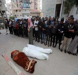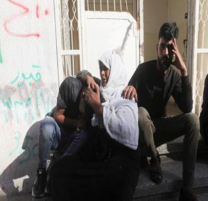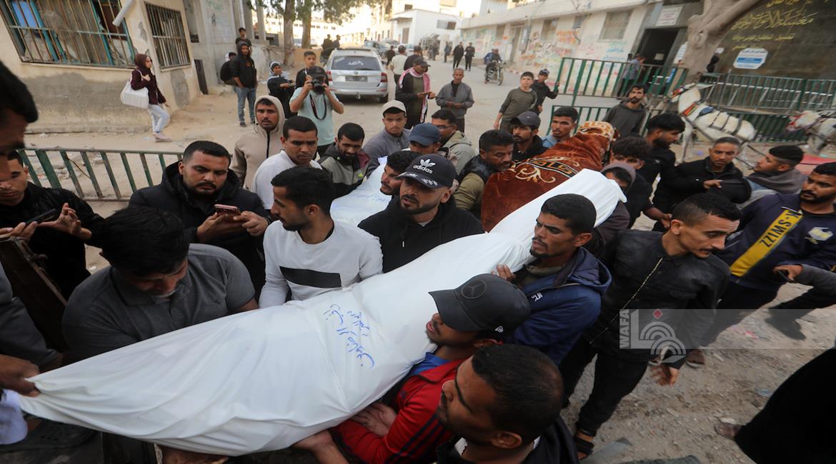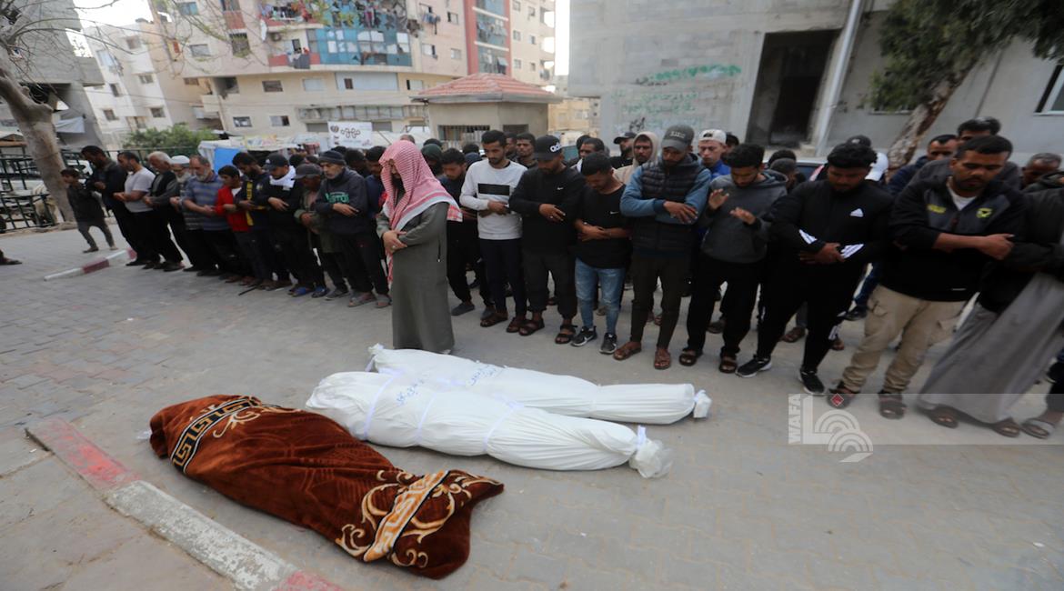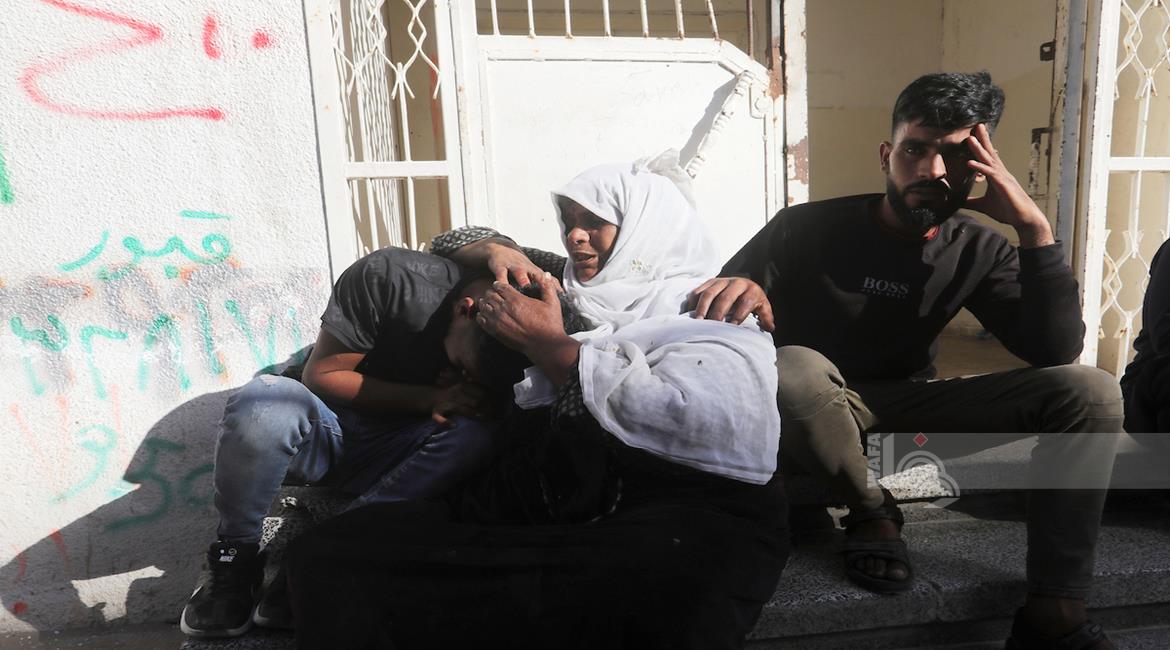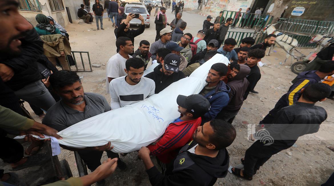 غزة - وداع وتشييع ثلاثة شهداء في مستشفى الشفاء بمدينة غزة ارتقوا في غارة إسرائيلية استهدفت مجموعة من المواطنين بحي الزيتون جنوب المدينة