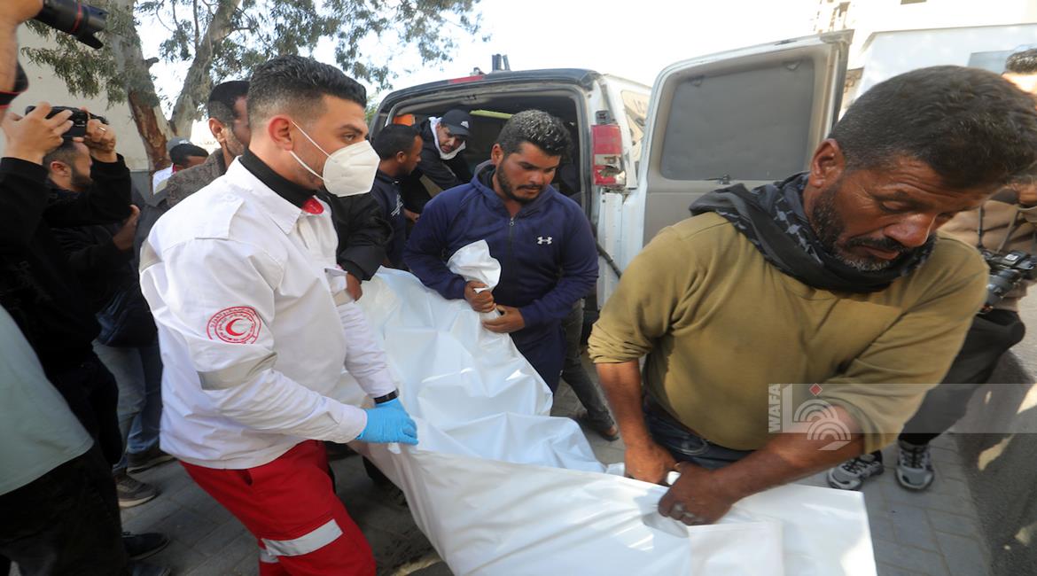 مواطنون ينقلون شهداء ومصابين إلى مستشفى الشفاء جراء غارة إسرائيلية استهدفت مركبة غرب مدينة غزة