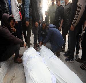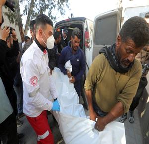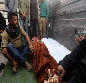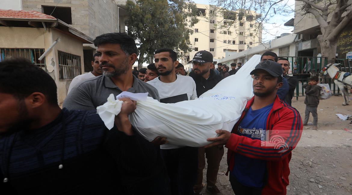 مواطنون ينقلون جثمان طفل وعدداً من المصابين إلى مجمع ناصر الطبي جراء استهداف إسرائيلي لمجموعة من المواطنين في خان يونس جنوب قطاع غزة.
