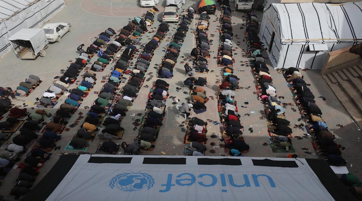 مواطنون يؤدون صلاة الجمعة داخل مدرسة تابعة لوكالة غوث وتشغيل اللاجئين في مدينة غزة تم تحويلها إلى مأوى للنازحين بعد العدوان الإسرائيلي