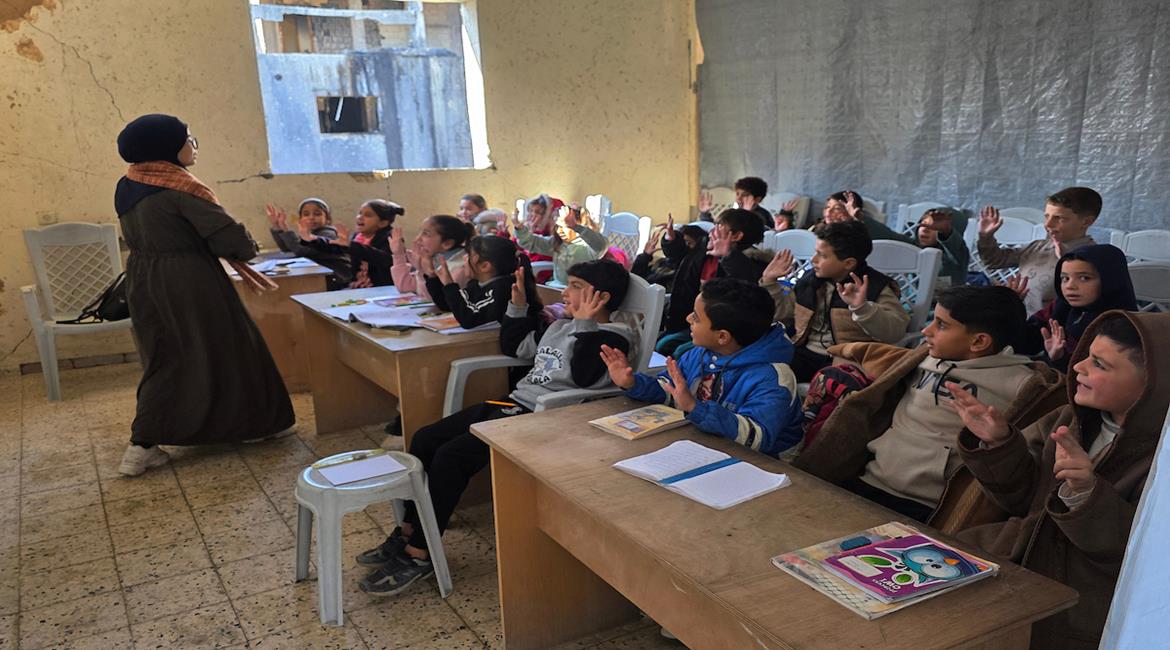 أطفال غزيون يتلقون تعليمهم في مركز تعليمي بخان يونس جنوب قطاع غزة، وسط مخاوف من الاستهداف الإسرائيلي، بعد تدمير معظم المدارس وحرمان مئات الآلاف من الطلبة من التعليم.