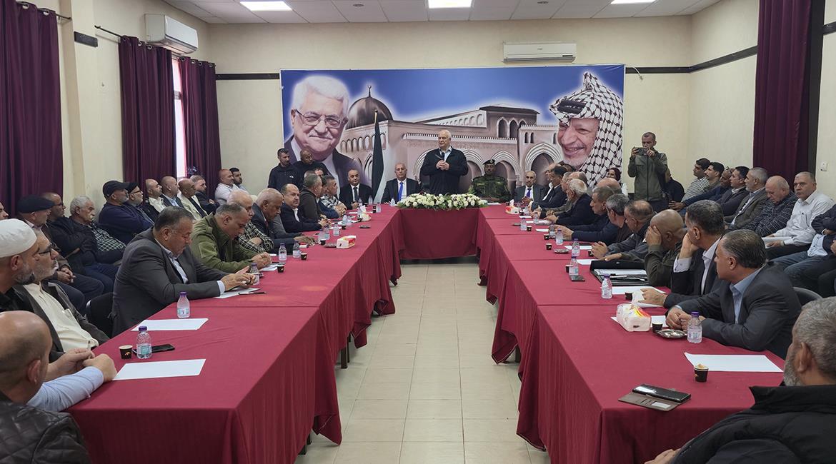 اجتماع بحضور وزير الداخلية اللواء زياد هب الريح في مقر محافظة جنين لبحث قضايا السلم الأهلي في المحافظة.