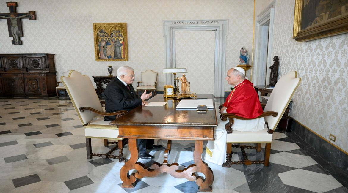 الرئيس محمود عباس أثناء اجتماعه في حاضرة الفاتيكان مع قداسة البابا ليو الرابع عشر