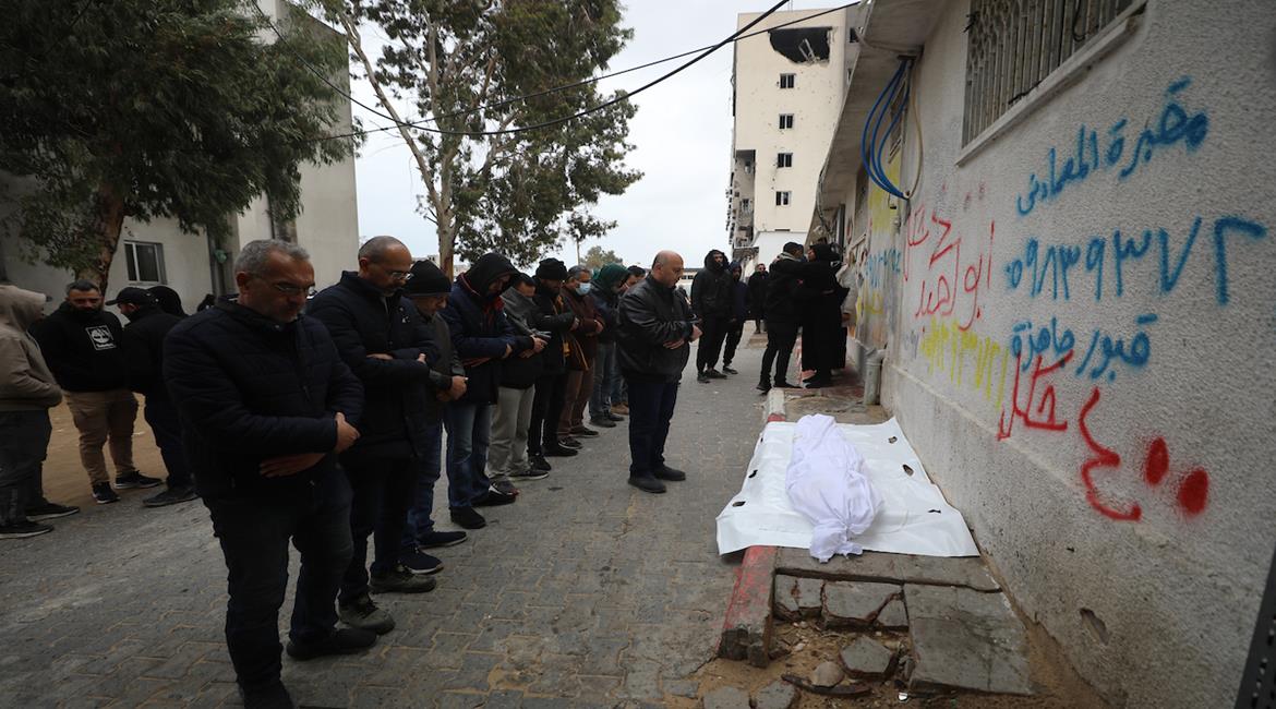 تشييع الشهداء الذين ارتقوا جراء انهيار مبان متضررة من الحرب في يوم شتوي عاصف بمدينة غزة