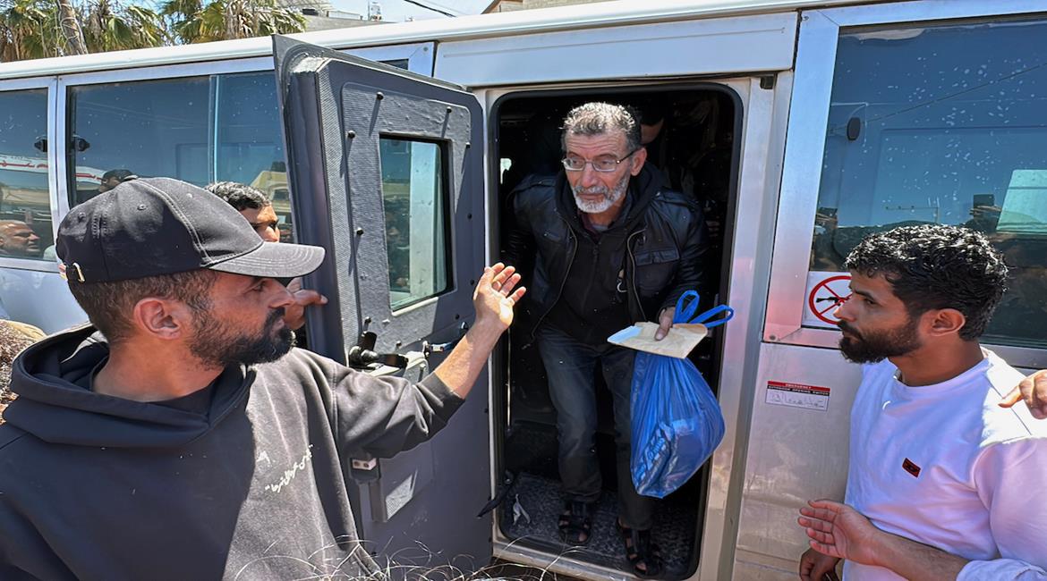 وصول 14 أسيراً إلى مستشفى شهداء الأقصى في دير البلح وسط قطاع غزة، عقب الإفراج عنهم من قبل قوات الاحتلال