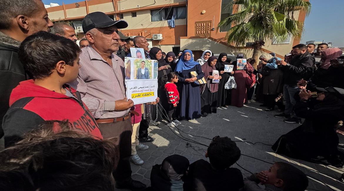 مواطنون يشاركون في وقفة احتجاجية لعائلات المختفين قسراً أمام مجمع ناصر الطبي في خان يونس، جنوب قطاع غزة