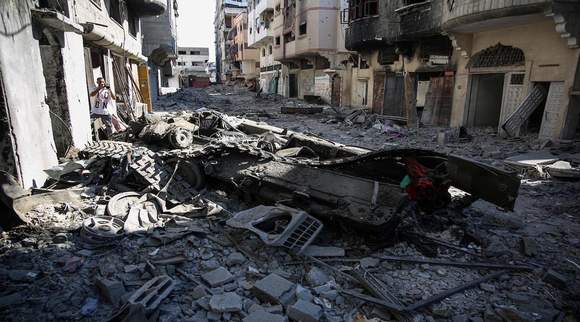 بقايا ذخائر عسكرية وروبوت متفجر وشعارات باللغة العبرية خلفها الاحتلال وسط أنقاض المباني المدمرة في منطقة الكرامة شمال غزة