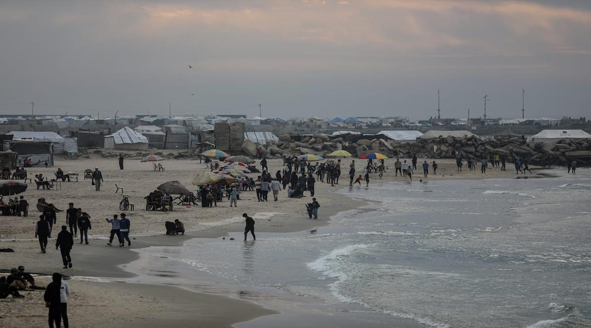 نازحون يقضون وقتهم على الشاطئ مقابل خيامهم الممتدة على طول ميناء غزة