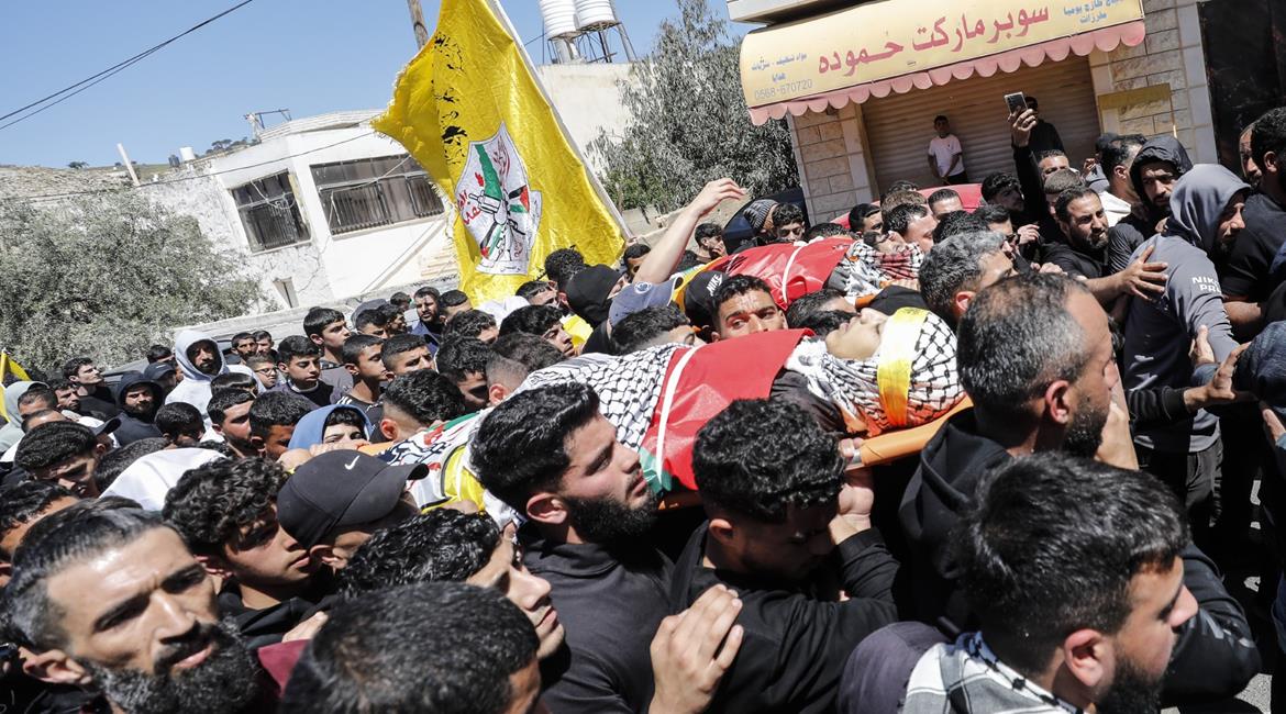 مواطنون يشيعون جثماني شهيدين من عائلة العطار بعد استهدافهم من قبل الاحتلال الاسرئيلي في منطقة العطاطرة شمال قطاع غزة
