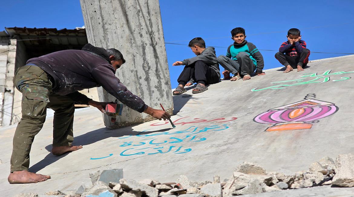 الفنان هاني دهمان يزين ما تبقى من الأحياء وركام المنازل المدمرة برسومات وعبارات ترحيبا بقرب حلول شهر رمضان في خان يونس