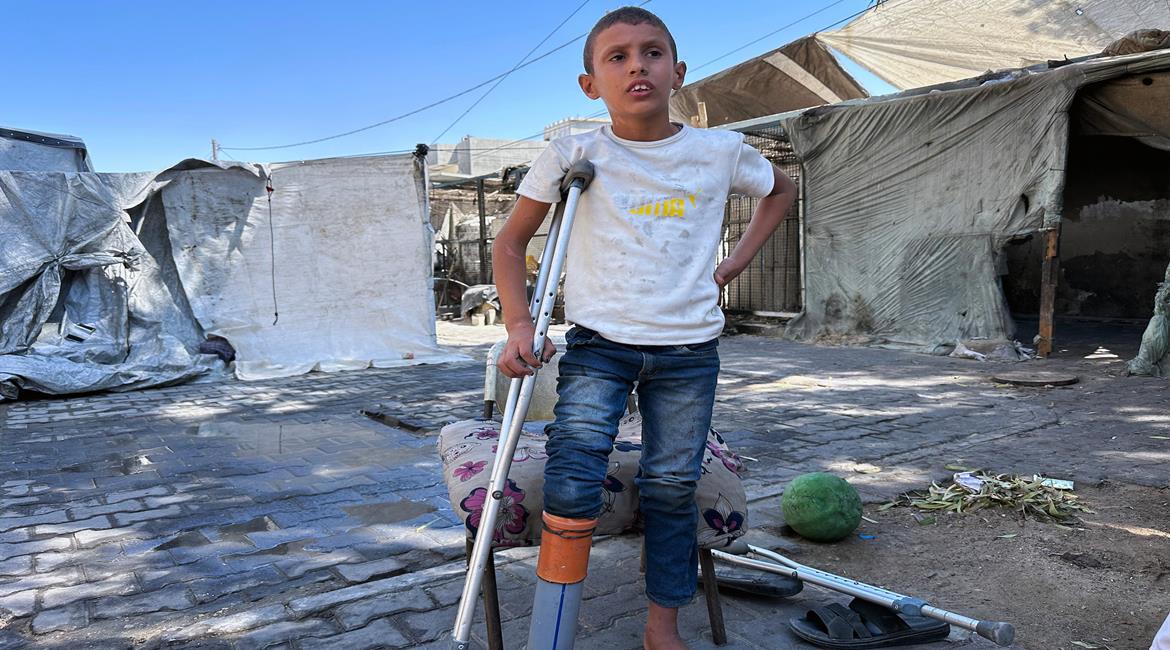 الطفل راتب اقليق (10 أعوام) يعيش مع جده داخل خيمة في دير البلح بعد أن فقد والدته وشقيقه جراء القصف خلال زيارته لهما في خانيونس، يستخدم راتب أنبوب صرف صحي كبديل عن طرف صناعي لمساعدته على الحركة بعد أن أصيب في القصف ذاته وبترت ساقه في وقت يحتاج فيه إلى تركيب طرف صناعي ورعاية طبية وتأهيل عاجل، وسط النقص الحاد في المعدات الطبية جراء استمرار الحرب