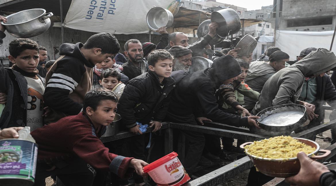 نازحون يتجمعون للحصول على الطعام المجاني في مخيم النصيرات مع تفاقم نقص الغذاء