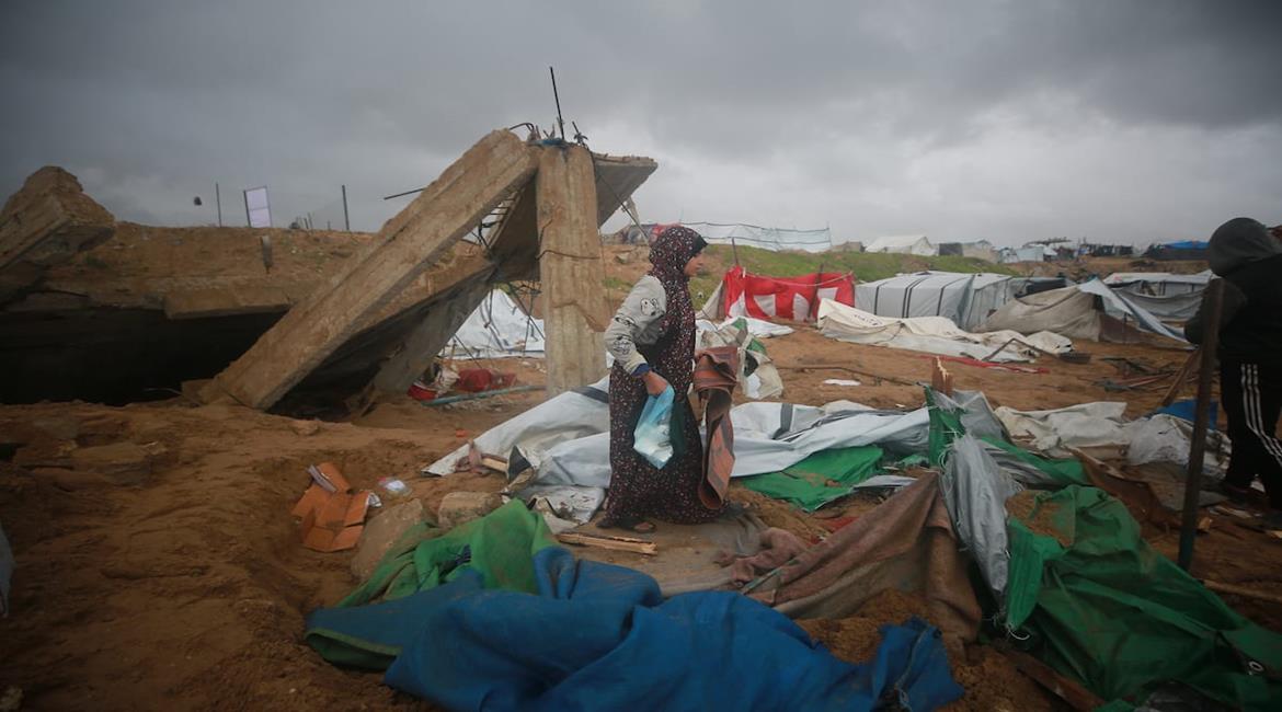 نازحون يحاولون استخراج أمتعتهم من موقع غارة إسرائيلية استهدفت خياما للنازحين غرب مدينة غزة