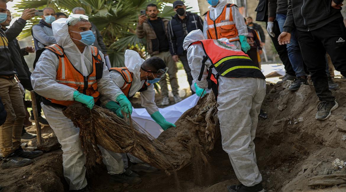 انتشال جثامين شهداء من قبور مؤقتة داخل المستشفى المعمداني في مدينة غزة لإعادة دفنها في مقبرة
