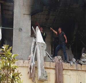 جنين - مواطنون يتفقدون بناية سكنية في مخيم جنين قصفتها قوات الاحتلال بالقذائف، بعد محاصرتها منذ ساعات الصباح.