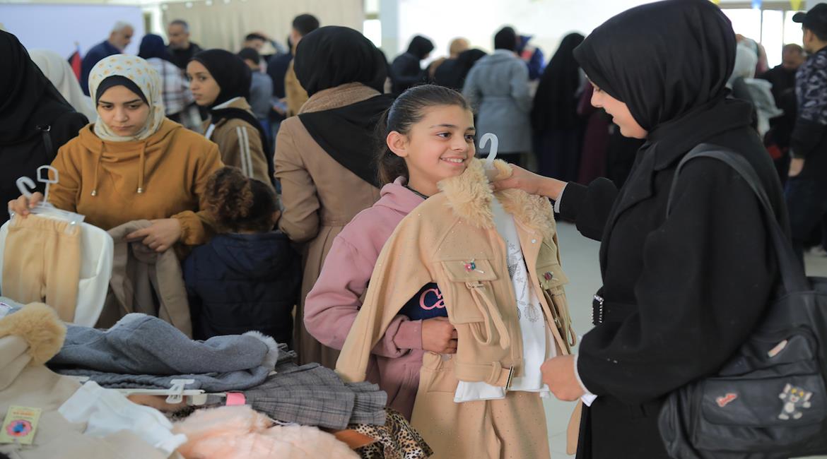 توزيع ملابس العيد على الأطفال الأيتام الذين فقدوا آباءهم خلال الحرب، بدعم من إحدى المنظمات الخيرية، في مخيم النصيرات للاجئين وسط قطاع غزة