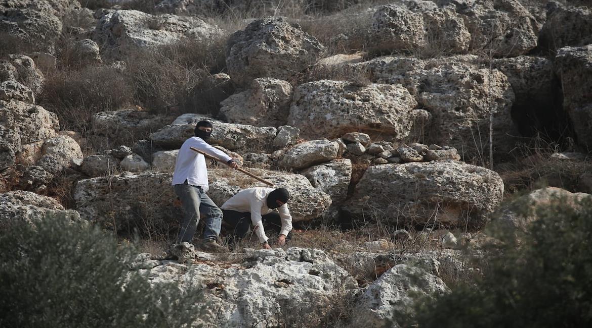 مستعمرون خلال مهاجمتهم للمشاركين في فعالية لقطف الزيتون في بلدة بيتا