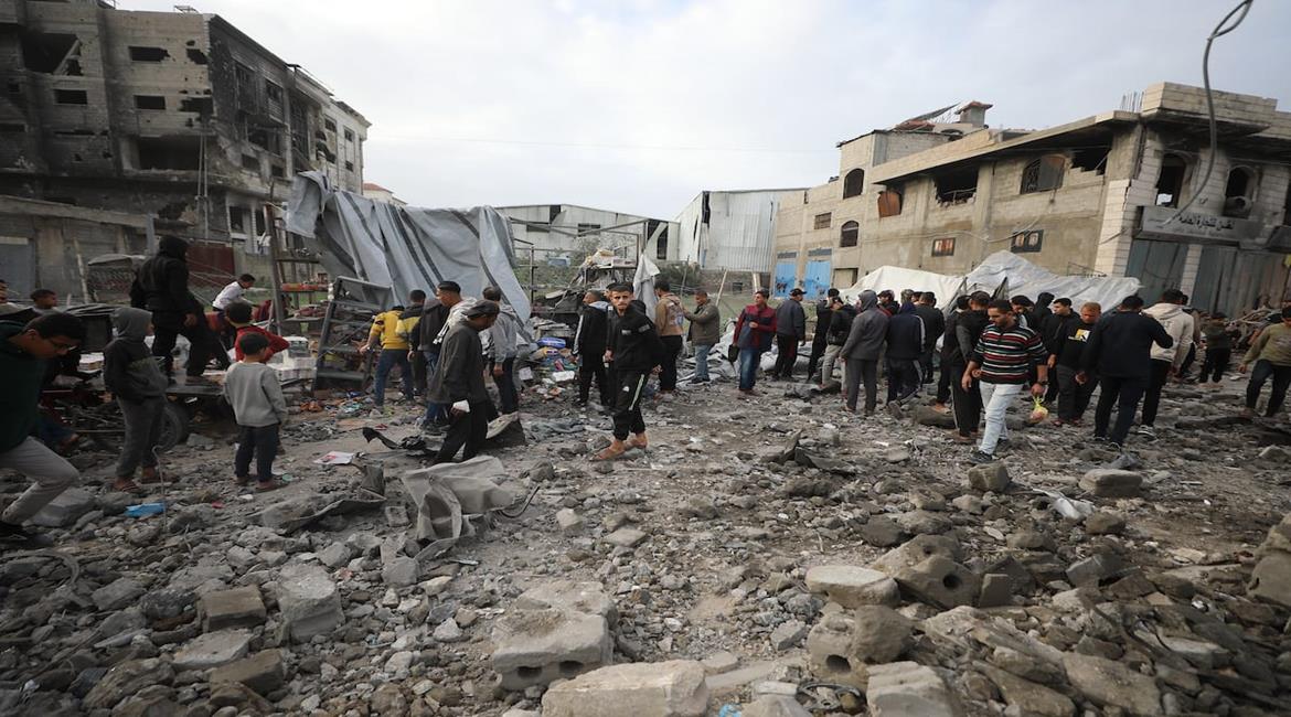 مواطنون يتفقدون الدمار جراء قصف الاحتلال مبنى سكني من ثلاثة طوابق في حي الزيتون بمدينة غزة