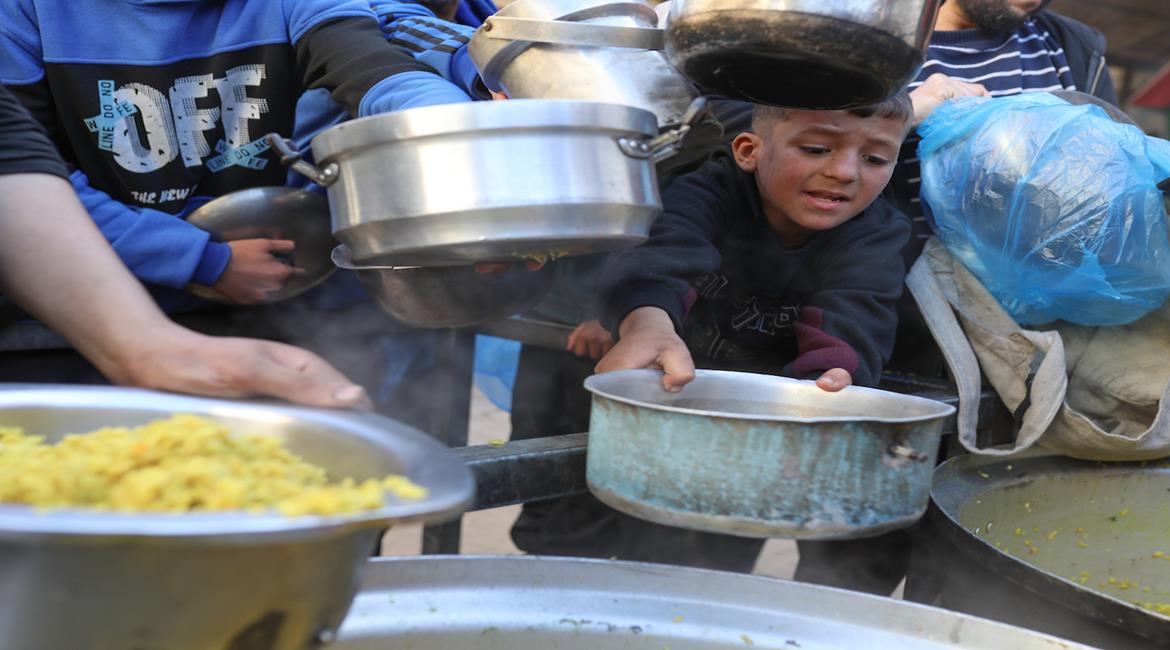 نازحون يتجمّعون للحصول على وجبة الإفطار في شهر رمضان من تكية خيرية في مخيم النصيرات وسط قطاع غزة
