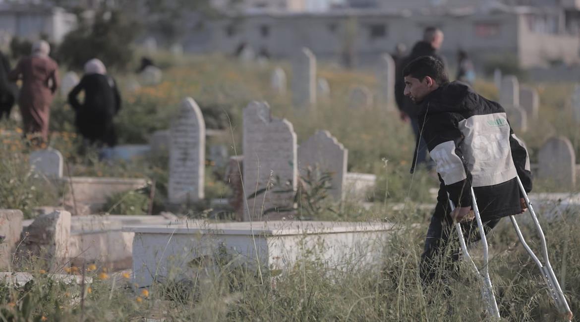 فلسطينيون يزورون قبور أحبائهم الذين استشهدوا خلال الحرب ودُفنوا في مقبرة الشيخ رضوان في مدينة غزة.