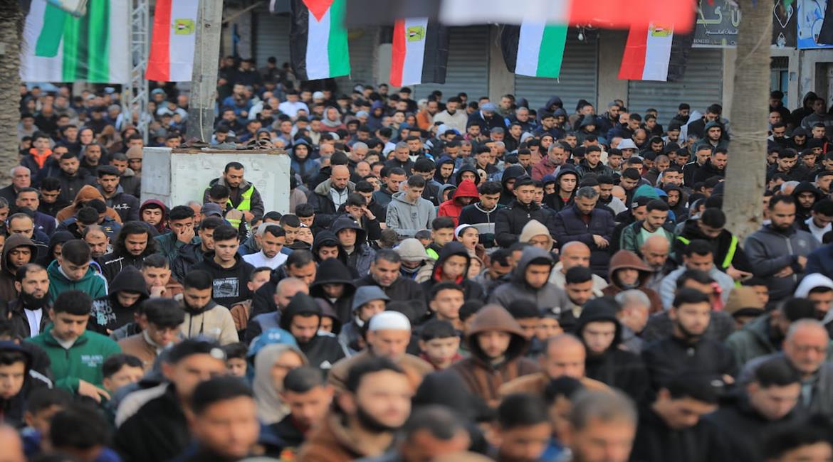 نازحون يؤدّون صلاة عيد الفطر في الشارع الرئيسي بمخيم النصيرات، وسط قطاع غزة