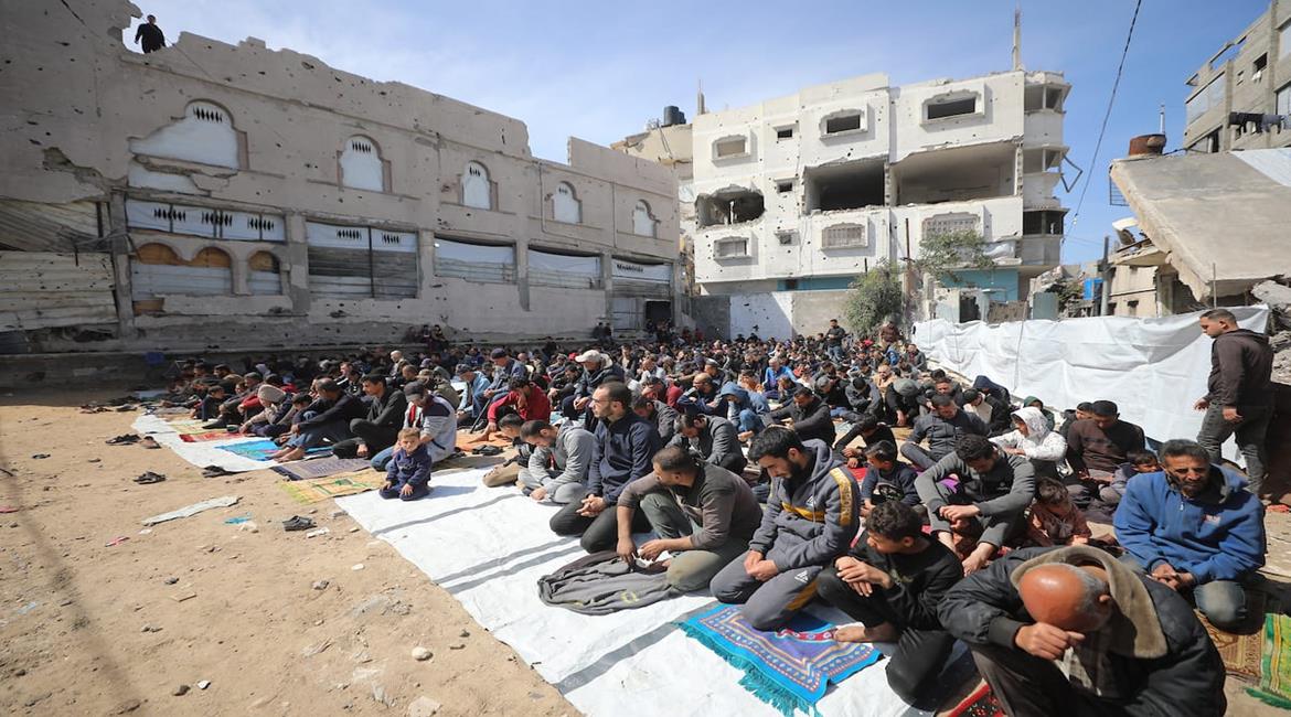 مواطنون يؤدون صلاة الجمعة الثالثة من شهر رمضان بين أنقاض مسجد صلاح الدين الذي دُمّر جراء الغارات الإسرائيلية خلال الحرب، في حي الزيتون بمدينة غزة