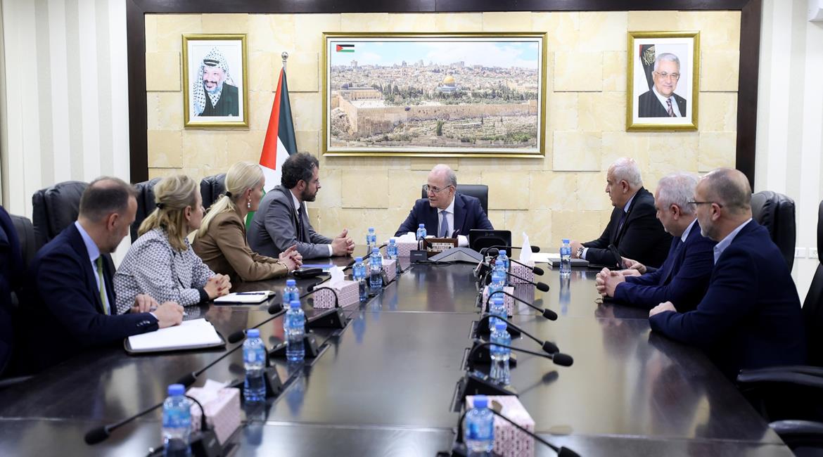 رئيس الوزراء محمد مصطفى أثناء لقائه وفداً من بعثة الاتحاد الأوروبي لدعم الشرطة الفلسطينية وسيادة القانون (EUPOL COPPS) ، وبعثة الاتحاد الأوروبي للمساعدة الحدودية لمعبر رفح (EUBAM Rafah)