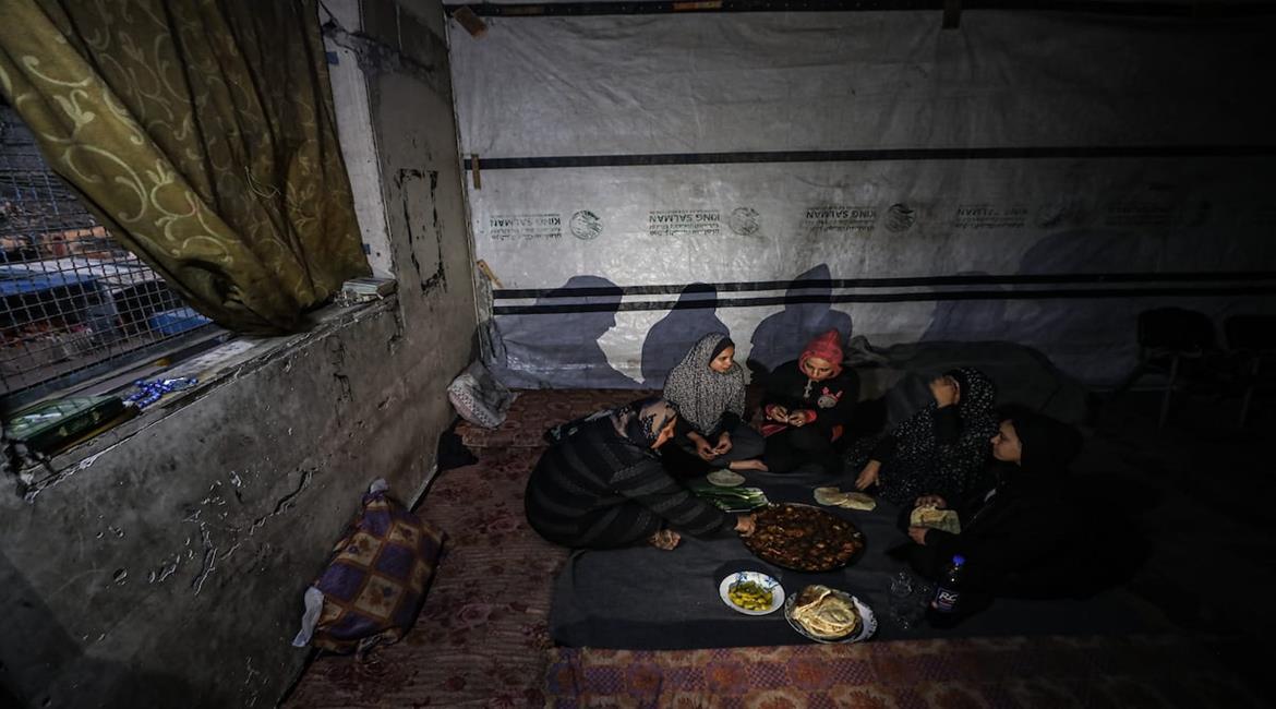 النازحة أم صقر حمد خلال إفطارها مع أطفالها في مكان نزوحها داخل أحد مراكز الإيواء التابعة للأونروا في مدينة غزة، في ظل أوضاع إنسانية صعبة يعيشها النازحون مع حلول شهر رمضان