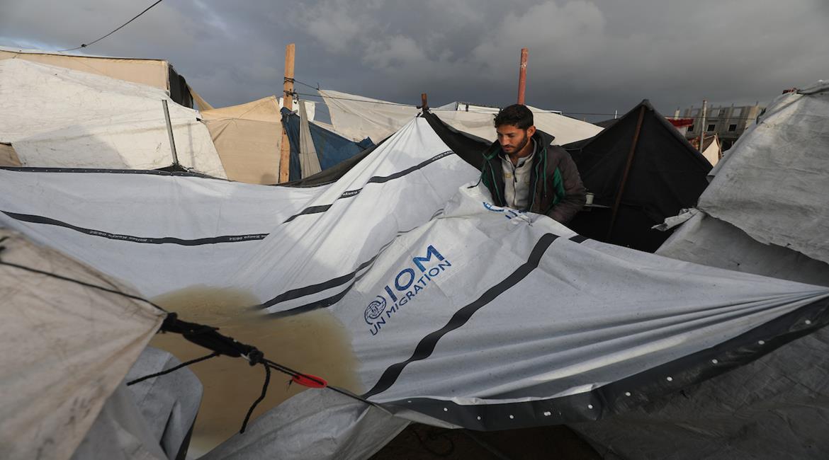نازحون يحاولون إصلاح خيامهم التي تضررت نتيجة الاحوال الجوية العاصفة في مخيم النصيرات