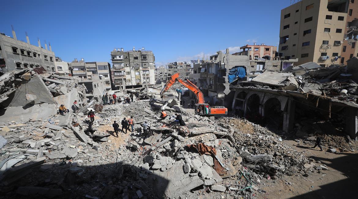 البحث عن جثامين شهداء تحت أنقاض مبنى مدمّر بقصف إسرائيلي في حي الشيخ رضوان بمدينة غزة