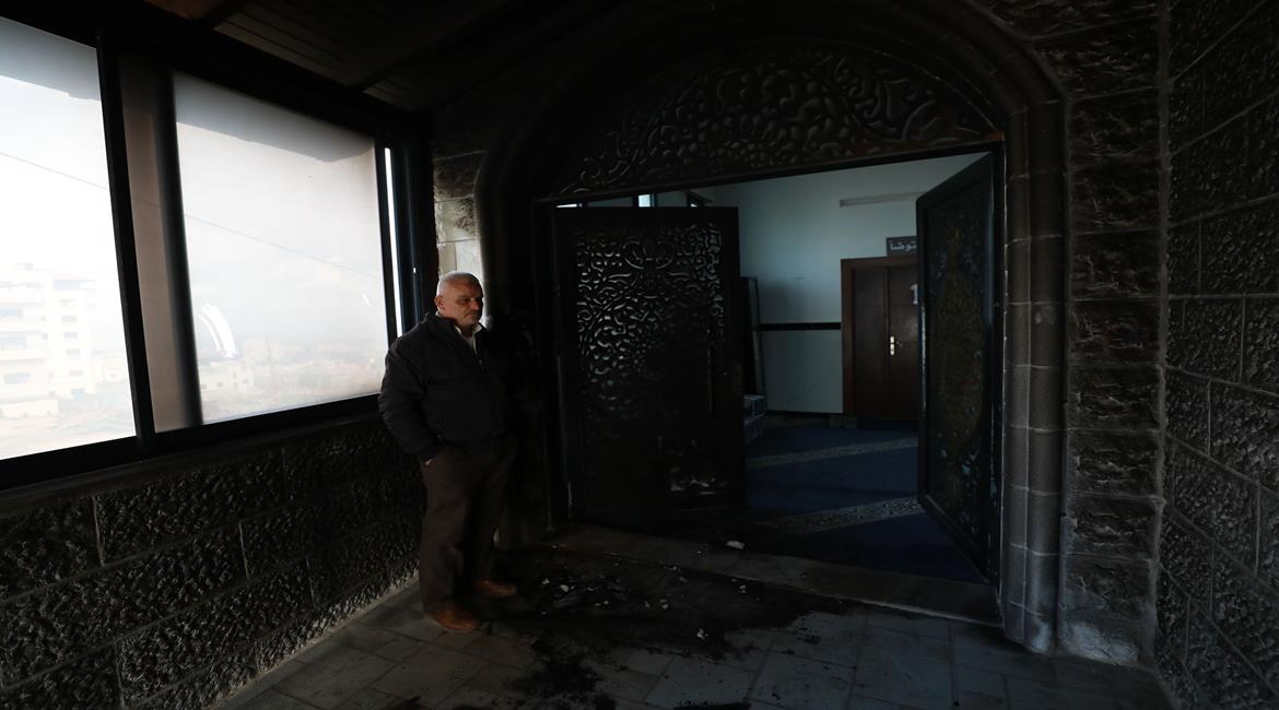 مواطنون يتفقدون آثار إحراق مستعمرين لمسجد أبو بكر الصديق في قرية تل