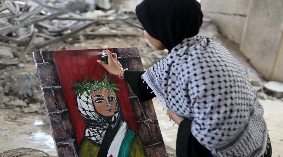 الفنانة الشابة ندى رجب تحيي ذكرى يوم الأرض الفلسطيني برسومات تجسد الهوية الفلسطينية، أنجزتها بين الأنقاض في مدينة غزة